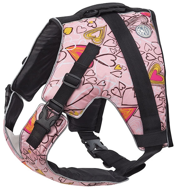The Doggles Medium Swim Vest is currently available in a bright pink color with a heart design, making it both stylish and visible in the water.