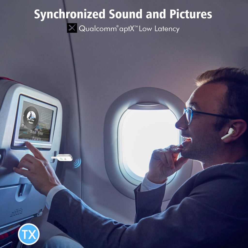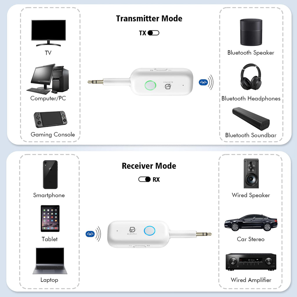 Bluetooth 5.2 Audio Transmitter Receiver for TV to 2 Headphones, ByDiffer Wireless Dual Link 3.5mm Jack AptX Low Latency Aux Bluetooth Adapter for Car, Airplane, Gym, PC (White)