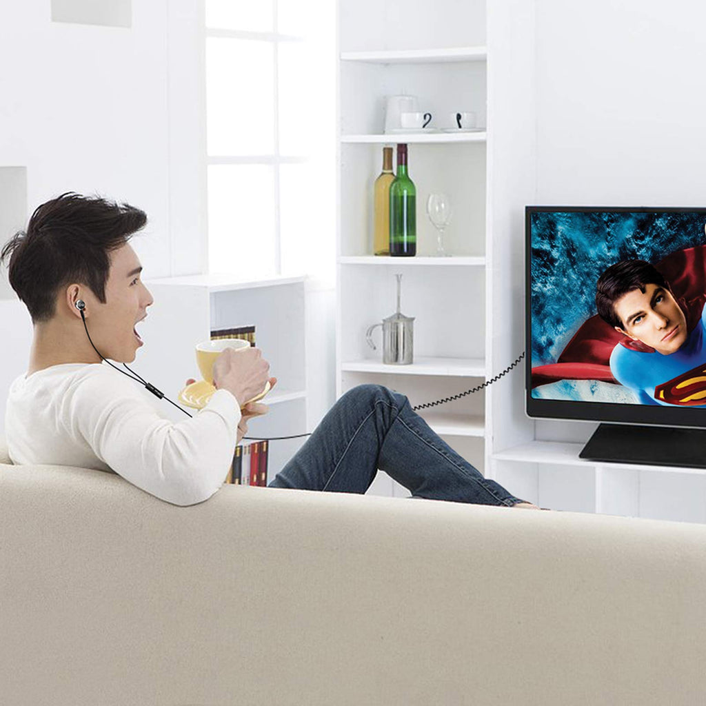 Indispensable Earbuds for Watching TV A 12FT Long Wire allows you to move freely When Watching TV FEATURES:12FT extendable coiled spring cable Premium TPU Wire is great for durable using Integrated Volume Control allows you to adjust volume in secondsHands-free & Mic for most convenience and multiple purposeClear Crystal Sound provides a joyful entertainment time Magnetic Buds & Cable Tie for neatly storage, no messy! What's in the box? *ChanGeek Wired Earbuds CGS06 *Cable Clip *Spare Ear Tips (Large, Small) *Cable Tie Compatible with all of your 3.5mm (1/8 ) audio jack devices: (ONLY compatible with 3.5mm (1/8 ) audio output jack, may say 'AUX out' or 'Audio out') *TV, PC or laptop*Electronic keyboard, Electronic drum set*Tablet or mobile phoneDoesn't work / not recommended: *Will NOT work with TVs that ONLY have optical and / or coaxial audio output*TVs with only a big 6.35mm (1/4 inch) phone jack will require a 6.35mm to 3.5mm adapter*TVs with only an RCA output will require an RCA to 3.5mm adapter*Apple devices with a lightning port for audio will require a lightning to 3.5mm adapter*Android devices with a Type C audio output will require a Type C to 3.5mm adapterNOTICE: *Please remember to use cable clip to prevent the earbuds from falling down.BUY THIS NEW VERSION WITHOUT ANY WORRY: Refer to user's feedback, we've made some important improvements: 1) The buds are changed from straight to the tilted shape for secure wearing, no falling off anymore! 2) The microphone and hands-free botton are built for great convenience. 3) The length of coiled cord is increased by 50cm (20 inches) longer, now it can be extended to 12 feet very easily.