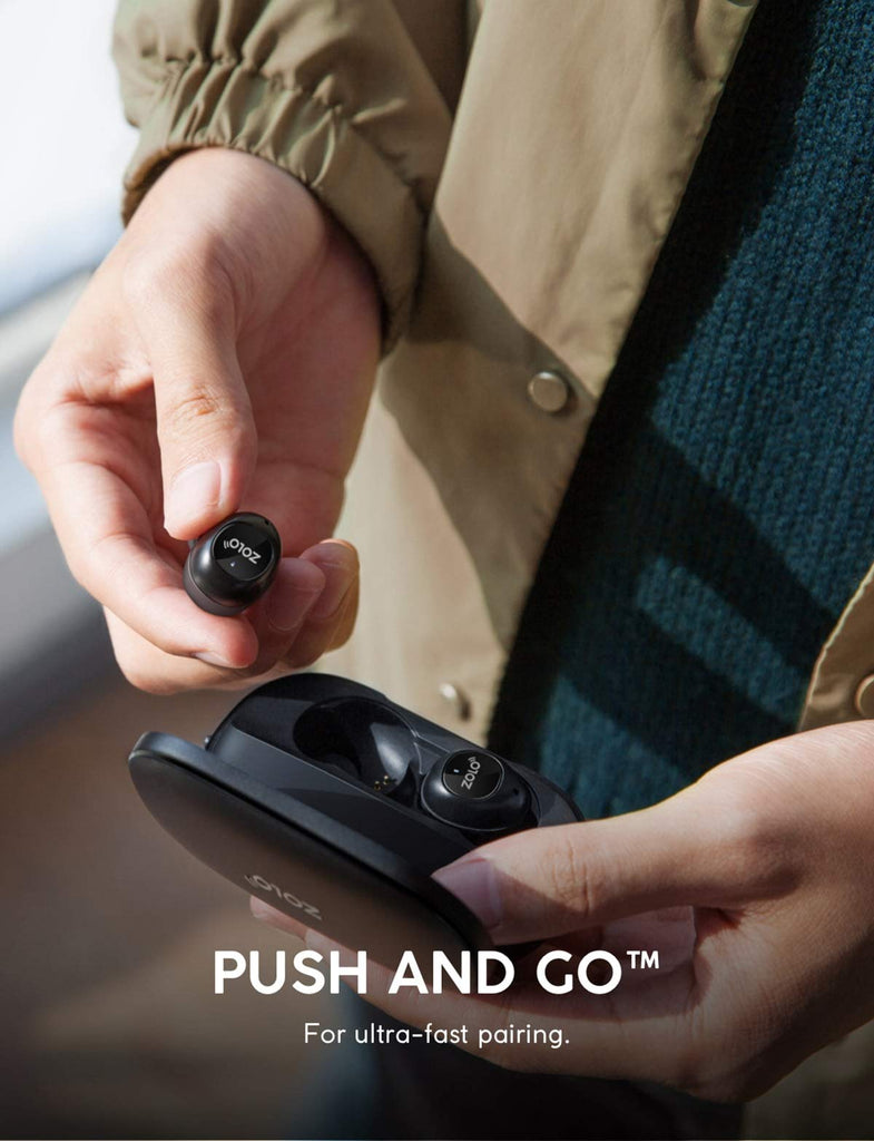 Enjoy unrestrained wireless listening with these ZOLO Liberty headphones. They boast a superior power management system that lets you enjoy up to 48 hours of graphene-enhanced sound, and the GripFit technology ensures a secure yet comfortable fit during extended workouts. The Smart Control feature of these ZOLO Liberty headphones provides quick access to playback operation with tap or press actions. Graphene-coated drivers Produce precision oscillation for superior sound across the entire frequency range. Truly-wireless headphones Let you listen to your favorite tracks with Bluetooth connectivity, so you won't be held back by wires. Bluetooth 4.2 interface Enables simple wireless pairing with your Bluetooth-enabled device. Rechargeable battery Offers up to 3.5 hours of playtime on a single charge, boosted to 24 hours with the included charging case. Sweat-resistant Provides protection from sweat, so you can easily wear headphones while working out. In-ear design Fits securely and directs music into your ears for full, uninterrupted audio. Headset controls Include answer/end, play/pause, next/previous track and reject call. Built-in microphone Enables simple hands-free chatting via a compatible device. PUSH AND GO Ensures ultra-fast pairing, while a single button-press activates Smart AI.