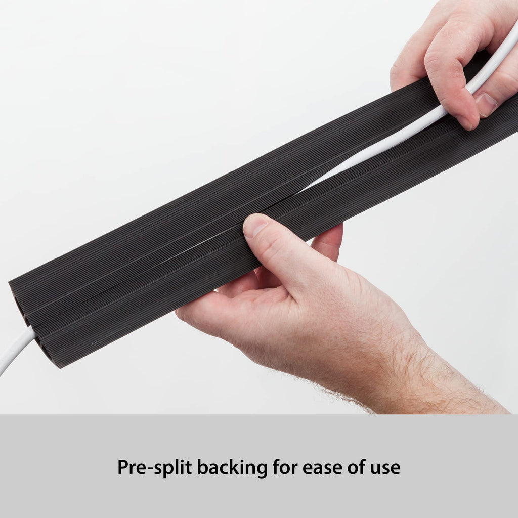 Protect trailing cords & prevent cable trips with Haven First Floor Cord Protector. Made in USA from high quality PVC to provide excellent cord protection. Flexible PVC simply uncoils to lay flat, avoiding need to apply adhesive tapes or add to boiling water to uncoil! Haven First Cord Protectors are commonly used to protect cords in; offices, warehouses, gymnasiums, events, retail, classrooms, gaming set-ups or anywhere trailing cords need to be covered! Haven First Cord Protectors are supplied as coiled 4' lengths, lengths can be scissor cut if shorter lengths are required. Cord Cavity = 0.63 (W) x 0.31 (H), sufficient for protecting 2x 0.31 cords for example. Each pack contains: 1x 4ft Length 2.4 (W) x 0.44 (H) - Inner Channel = 0.63 (W) x 0.31 (H) - Black
