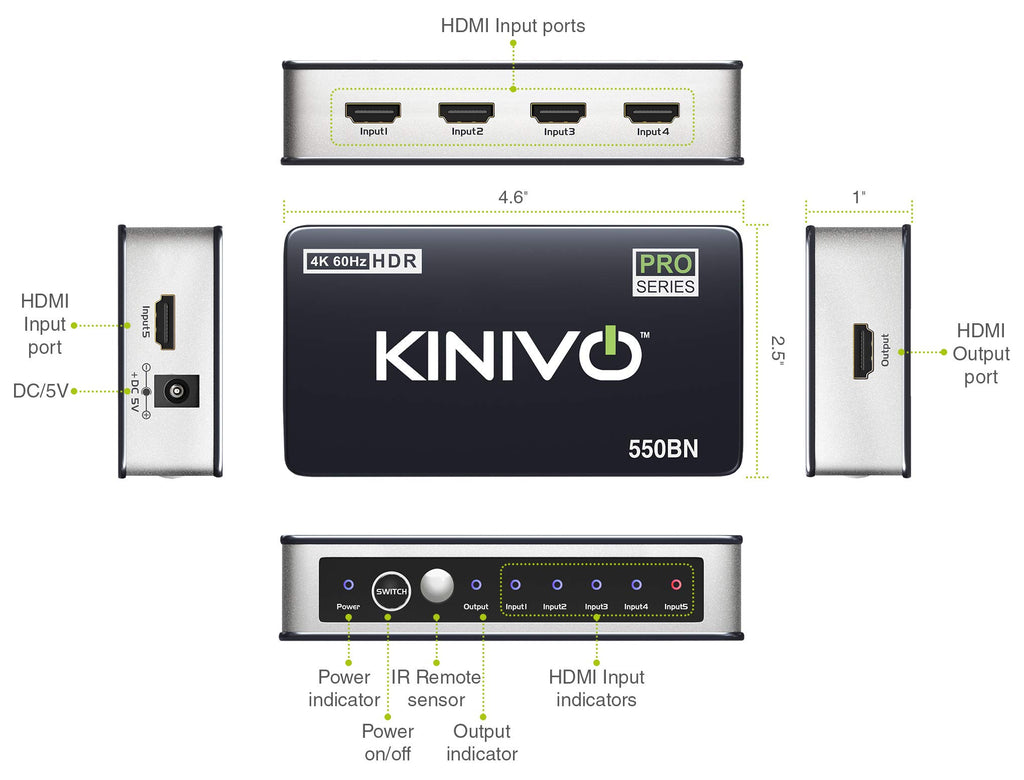 The Kinivo 550BN Premium 4K 60Hz HDMI Switch allows you to connect up to 5 devices to a single HDTV or projector to streamline and organize your home theater setup. Connect Blu-ray players, gaming console, streaming media devices, and computers to your HDTV or projector to enjoy audio and video with stunning resolutions up to 4K@60Hz. The Kinivo 550BN supports HDCP 2.2 to unlock a world of high-definition content.Key Features- Easily switch your HDTV between five video sources at up to 4K 60Hz resolution with automated (smart function) switching or manual switching- Supports display resolutions 4K 60Hz, 4K 30Hz and 1080p- Compatible with all HDMI video sources including Blu-Ray players, gaming consoles, streaming media devices, etc.- Supports 48-bit Deep Color- Supports HDR and HDCP 2.2- Auto switching can be enabled and disabled by pressing and holding the Switchbutton- Switch inputs or power the switch on and off using the included remote Note: Apple TV, Xbox, PS4, Chromecast keep their HDMI port active even in sleep mode, so auto switching may not work. However, manual switching with the IR remote will work.Easy plug & play operation Simply plug in the hdmi input sources into the input connections and the output connection to your TV or projector. The Kinivo 550BN will automatically switch to the currently active input source if there is only one active input. If there are multiple active inputs, then you can select the input either using the IR remote or using the select button on the switch. The HDMI signal from the selected input is passed through to the output HDMI connectionWhat's in the Box- Kinivo 550BN 4K HDMI Switch- 5V AC/DC Power Adapter- Remote Control (battery included)- Quick Reference GuideWarrantyThe Kinivo 550BN is covered by 2 year limited hardware warranty and offers US based lifetime customer service support.