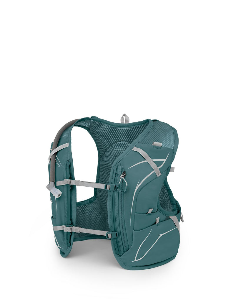 The vest includes several pockets designed to hold essentials like hydration, gels, and a phone. This allows for easy access while on the move.
