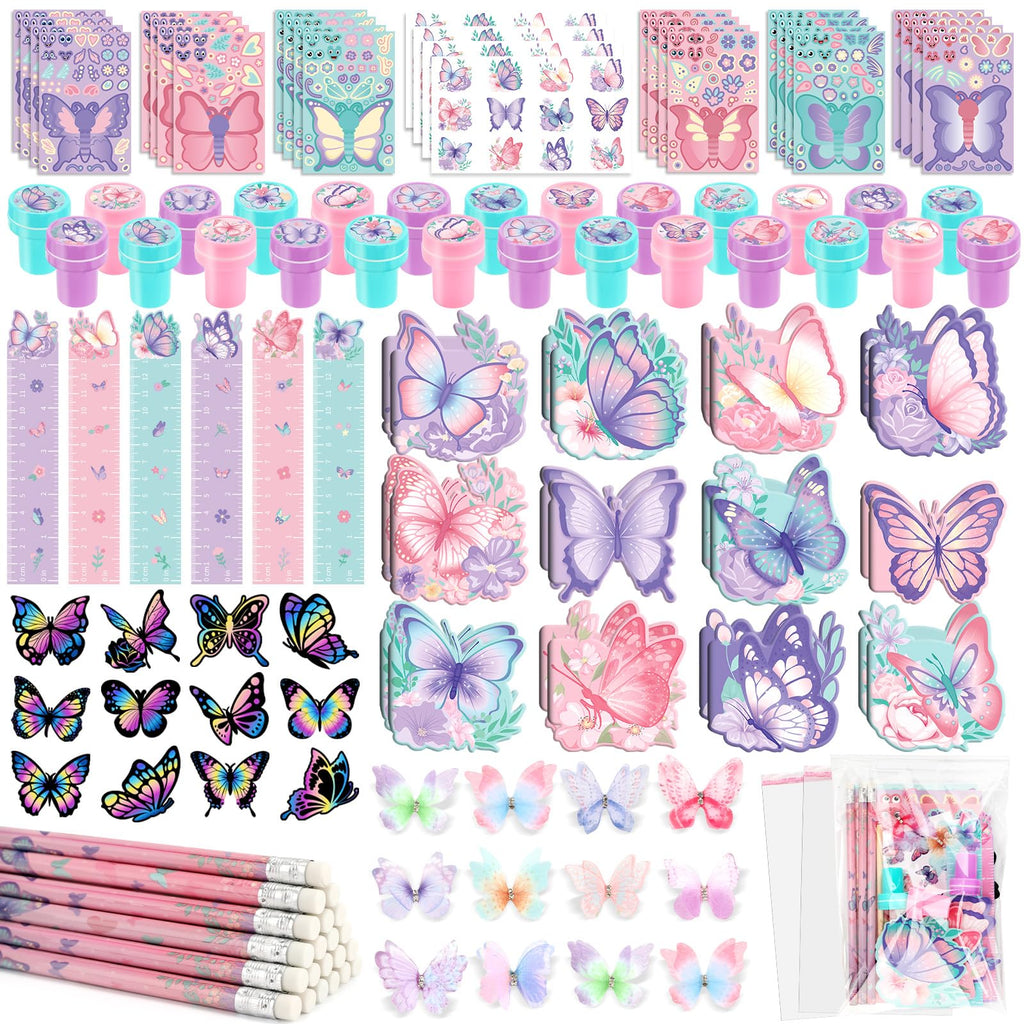 Features: Creative design: Inspired by our cute element for butterfly, the design is original and other attractive elements are added, the overall style is cute and interesting, children will love it very much, suitable for party activities. Gifts for kids: These butterfly school stationery set for kids are more suitable for kids because the fun designs are enough to catch their eyes. Kids will be delighted when you gift these butterfly stationery set .Also great as a school teacher rewards, game gift classroom or team, birthday goodie bag stuffers, pinata fillers. Specifications: Material: paper and rubber and plastic Color: as picture shown Package includes: 12 x Butterfly mini notebooks 12 x Butterfly pencils 12 x Butterfly color scratch 12 x Butterfly rulers 12 x Butterfly make-a-face stickers 12 x Butterfly toy 12 x Butterfly stampers 12 x Butterfly stickers 12 x Clear gift bags Warm notes: Please allow slight size error due to manual measurement. The color may exist slight difference due to different screen display