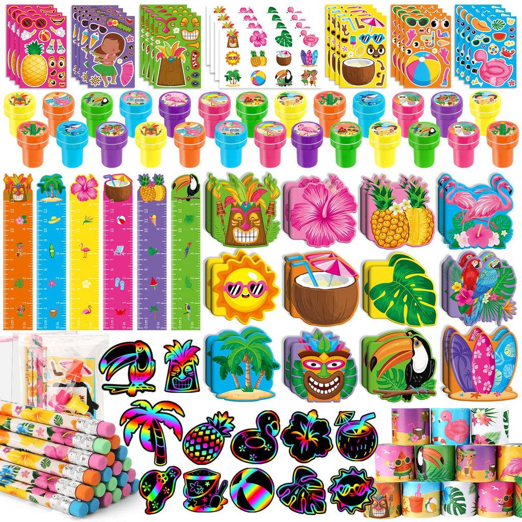 Features: Creative design: Inspired by our cute element for hawaiian, the design is original and other attractive elements are added, the overall style is cute and interesting, children will love it very much, suitable for party activities. Gifts for kids: These hawaiian school stationery set for kids are more suitable for kids because the fun designs are enough to catch their eyes. Kids will be delighted when you gift these hawaiian stationery set .Also great as a school teacher rewards, game gift classroom or team, birthday goodie bag stuffers, pinata fillers. Specifications: Material: paper and rubber and plastic Color: as picture shown Package includes: 12 x Hawaiian mini notebooks 12 x Hawaiian pencils 12 x Hawaiian color scratch 12 x Hawaiian rulers 12 x Hawaiian make-a-face stickers 12 x Hawaiian slap bracelets 12 x Hawaiian stampers 12 x Hawaiian stickers 12 x Clear gift bags Warm notes: CHOKING HAZARD - Small parts, Please do not put in your mouth! Please allow slight size error due to manual measurement. The color may exist slight difference due to different screen display