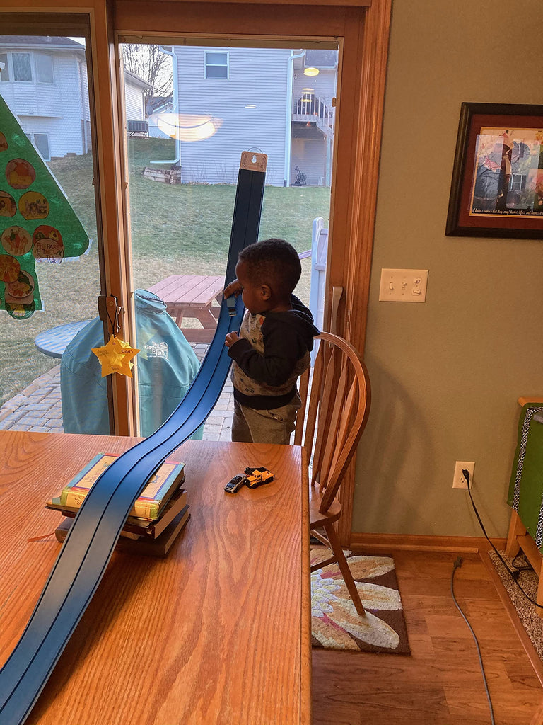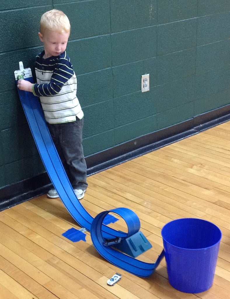 15 feet of highly flexible two-lane racetrack. Blu Track allows for custom racetrack configurations due to the flexible material. Set up and tear down within 30 seconds; no assembly required. Easy to move and store. No small parts. Additional Blu accessories, including cars, are sold separately. Includes 1 - 15 ft coil of 2 lanes wide Blu Track Classic Series racetrack (Age: 3+) 1 BluTrack Track anchor 1 BluTrack Adaptable Hanger System 1 Suction Cup Compatible with Blu Track Racer cars or any other 1/64th scale die-cast vehicle.