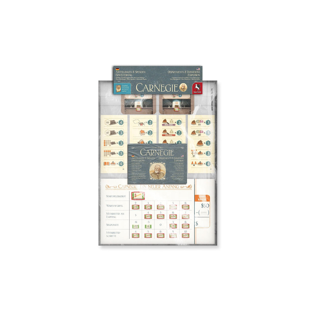 For All Fans Of Carnegie, The New Departments & Donations Expansion Adds Four New Modules That Can Be Played Independently Or In Any Combination. The Module A New Beginning Sets Up An Asymmetrical Game, Where Players Secretly Manage Their Starting Money And Initial Resources, Setting Their Strategy Into Motion Before The First Turn Even Begins. Other Modules Introduce A Total Of Sixteen New Departments And Four New Donation Tiles To The Game. To Challenge The Most Experienced Players With New Twists, The Departments & Donations Expansion Includes Three Optional Rules That Can Be Added To The Game, Offering Fresh Gameplay Variants To Explore.