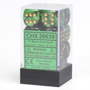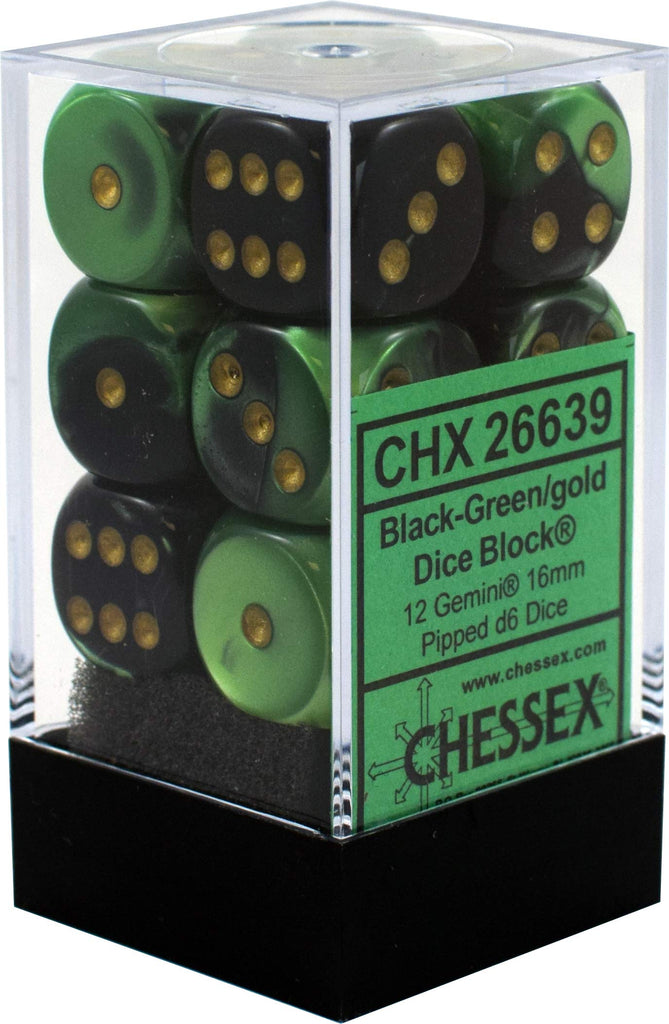 The DND Dice Set includes a total of 12 six-sided (D6) dice, each measuring 16mm, designed in a striking Gemini Black, Green, and Gold color scheme.