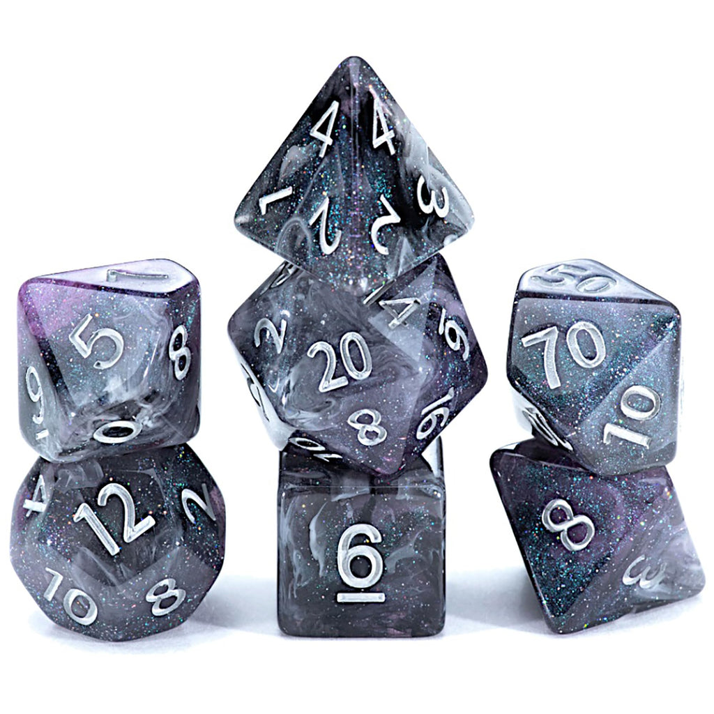 The Aether Dice: Limbo features a beautiful blend of black, purple, and white glitter swirl, creating a stunning visual effect with swirled colors.
