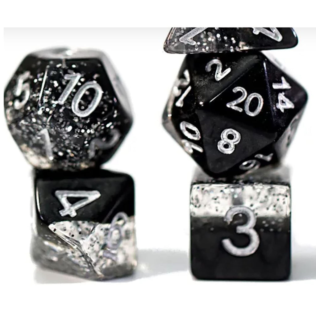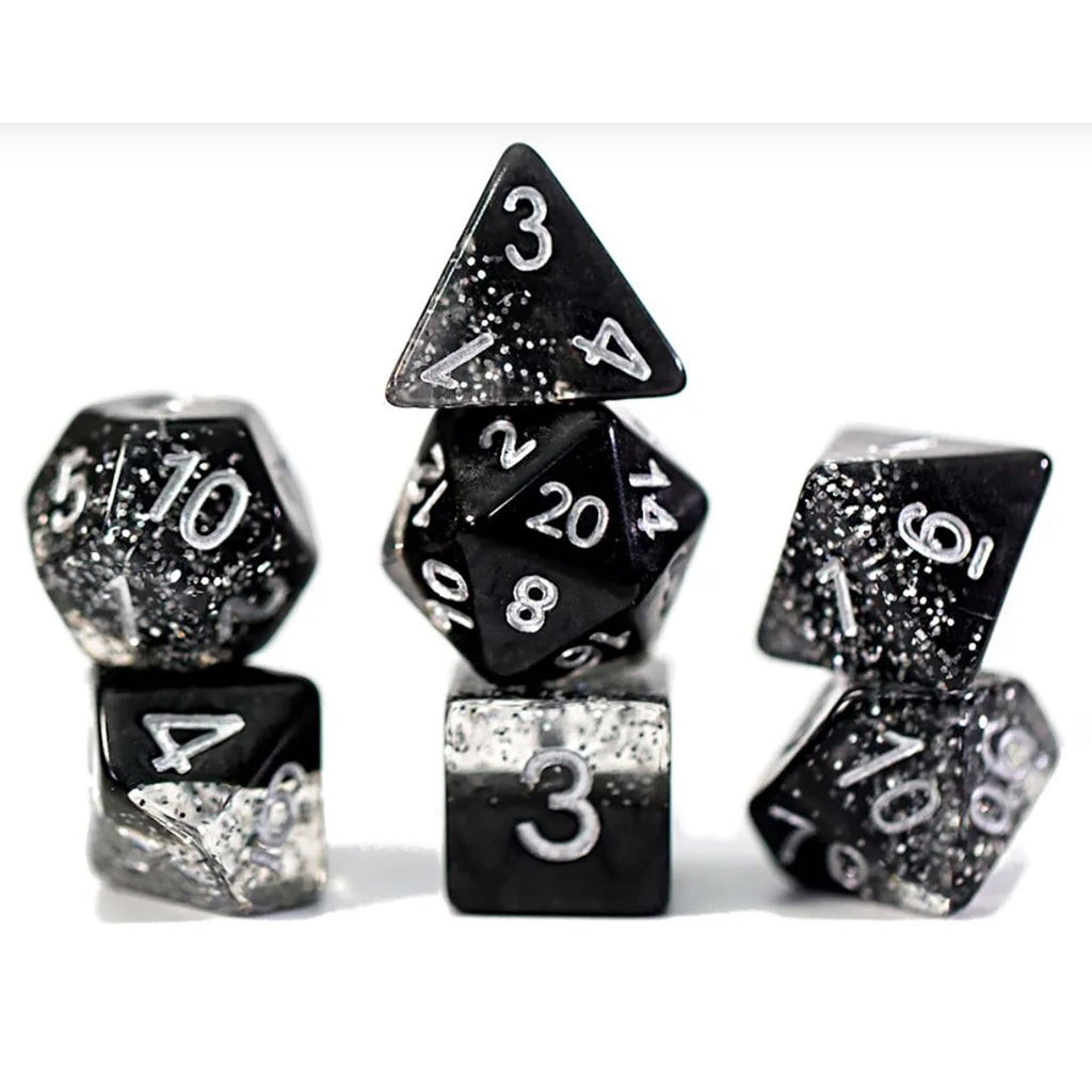 Black & Fine Silver Glitter - Silver Numbering Two-Tone Polyhedral Gaming Dice Set With A Beautiful Half & Half Design. Half One Pearlescent And Semi-Translucent Color, With A Fine Silver Glitter In Clear Transparent Resin For The Other Half. 7 Dice Per Set Including: D4, D6, D8, D10, D10%, D12, D20 And Comes In Our Exclusive Dice Keep Case. Easy-To-Read Numbering With Classy Precious-Metals Paint Colors. Extra High Density Resin And High End Dice Molds Make Every Halfsies A Near Perfect Balanced Die. Premium Dice, At A Price You Can Afford.