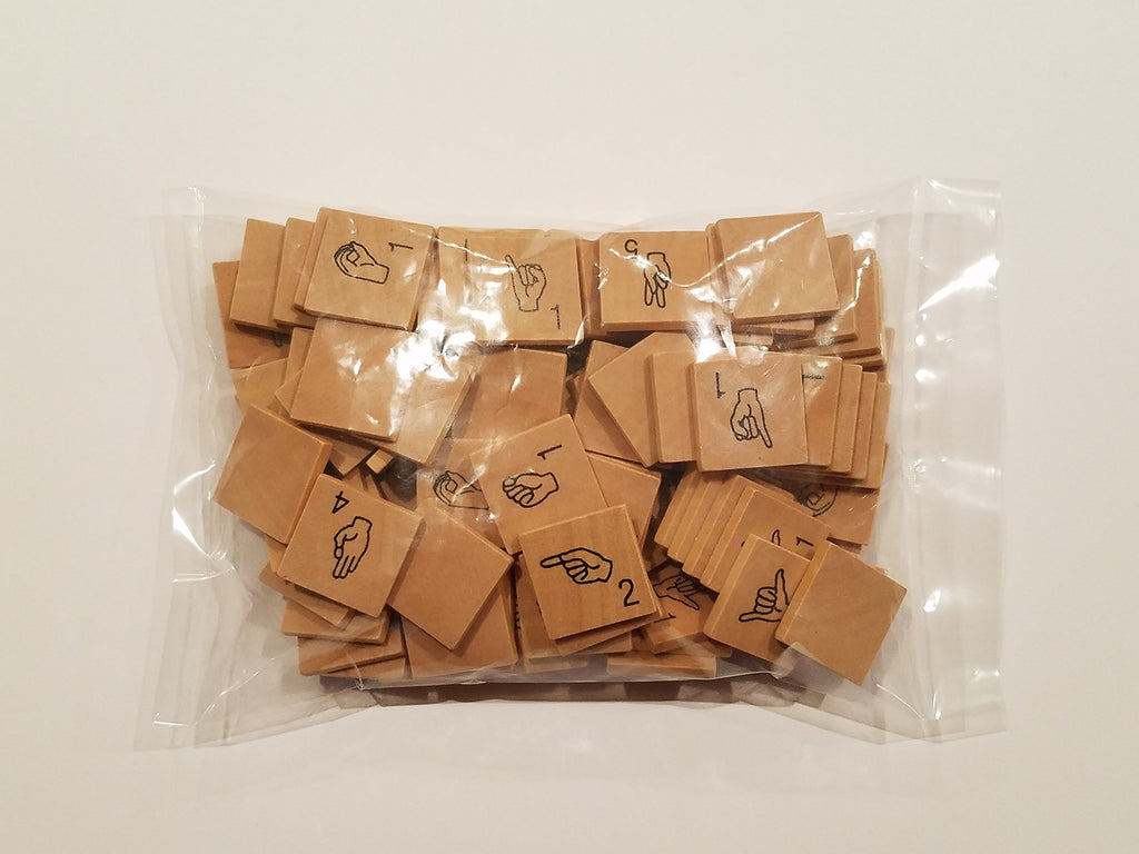 American Sign Language game tiles for learning ASL, playing games, and crafting! Master ASL faster and have fun while doing it. Imagine the ease of gaining proficiency through immersion based learning. This set of 100 wood tiles have clearly printed hand signs and point values. Set includes two blank wild card tiles for playing tile games. Tiles are 1/8 thick (slightly thinner than a standard tile). Includes the following standard 100 tile letter distribution: 1 point: E 12, A 9, I 9, O 8, N 6, R 6, T 6, L 4, S 4, U 4 2 points: D 4, G 3 3 points: B 2, C 2, M 2, P 2 4 points: F 2, H 2, V 2, W 2, Y 2 5 points: K 1 8 points: J 1, X 1 10 points: Q 1, Z 1 2 blank tiles (0 points)