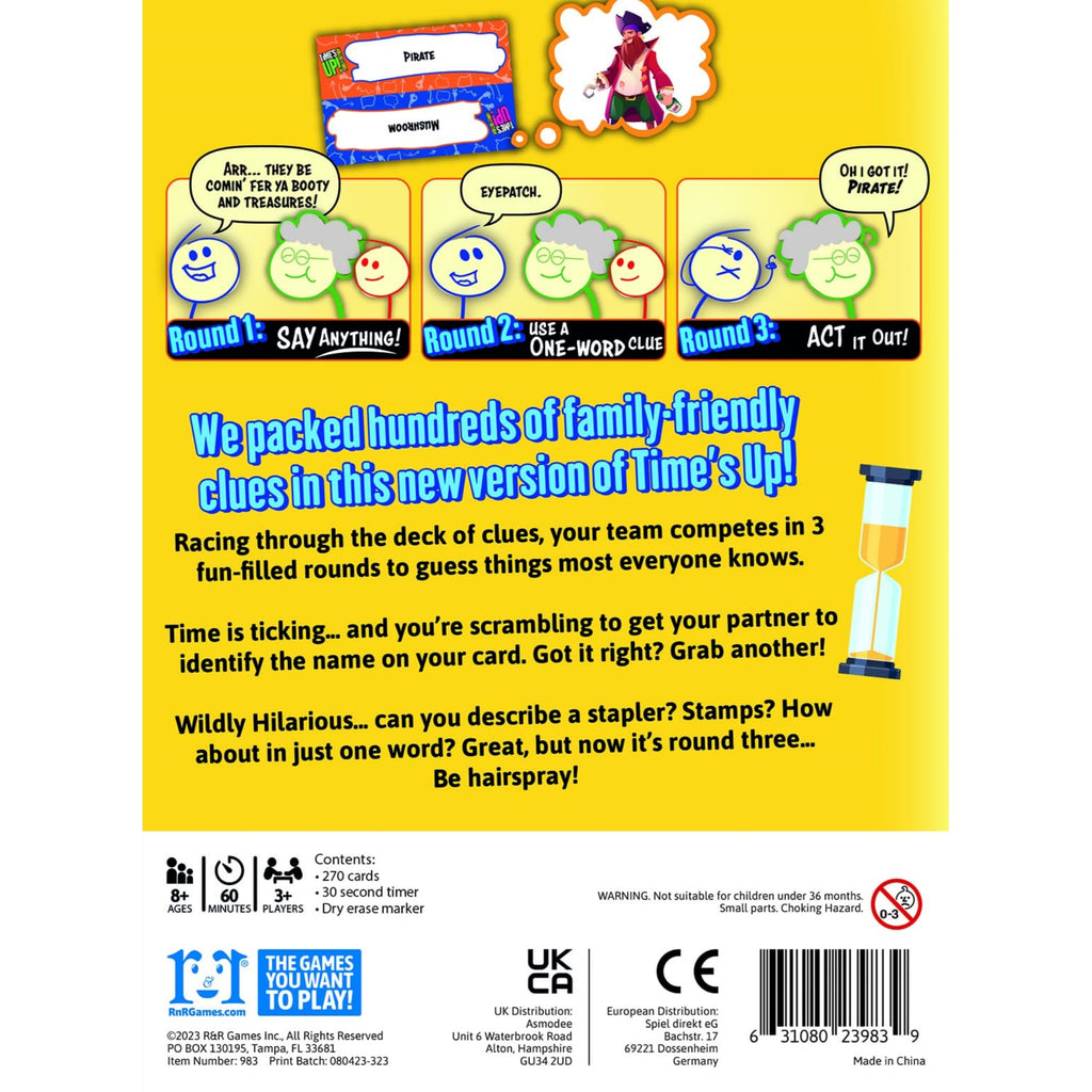 This game features 270 vibrant word cards, a 30-second sand hourglass timer, and a dry erase marker. It includes three rounds of play with varying clue-giving rules.