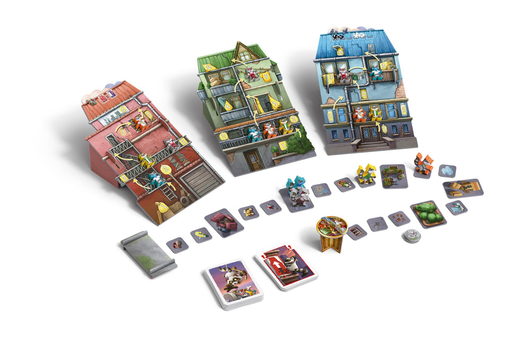 Wild Raccoons Lay Siege To The City! In The Game Racoon Robbers, The Racoons Are Roaming Around Looking For Food. Skillfully They Climb Up Houses, And Vault Into The Backyard With A Brave Leap. There, The Boss Of The Gang, Don Racoon, Is Already Waiting. He Has Only One Goal In Mind: The Golden Trash Can! Immediately The Raccoons Start Jostling And Shoving For All Its Worth - As We All Know, Food Is Where Friendship Stops. In Racoon Robbers, Players And Their Raccoon Boss Try To Be The First To Reach The Golden Trash Can. To Do So, They Climb Up The 3D Houses With Their Raccoons By Using Cards. For Risky Jumps, Points Are Awarded, Which Can Be Used To Move The Raccoon Boss. But Be Careful, As Cute As Raccoons Look, When They Get The Chance, They Push The Opposing Raccoons Out Of The Way Without Hesitation. All The Better If This Causes Other Raccoons To Tumble Down With Them And Clear The Way.