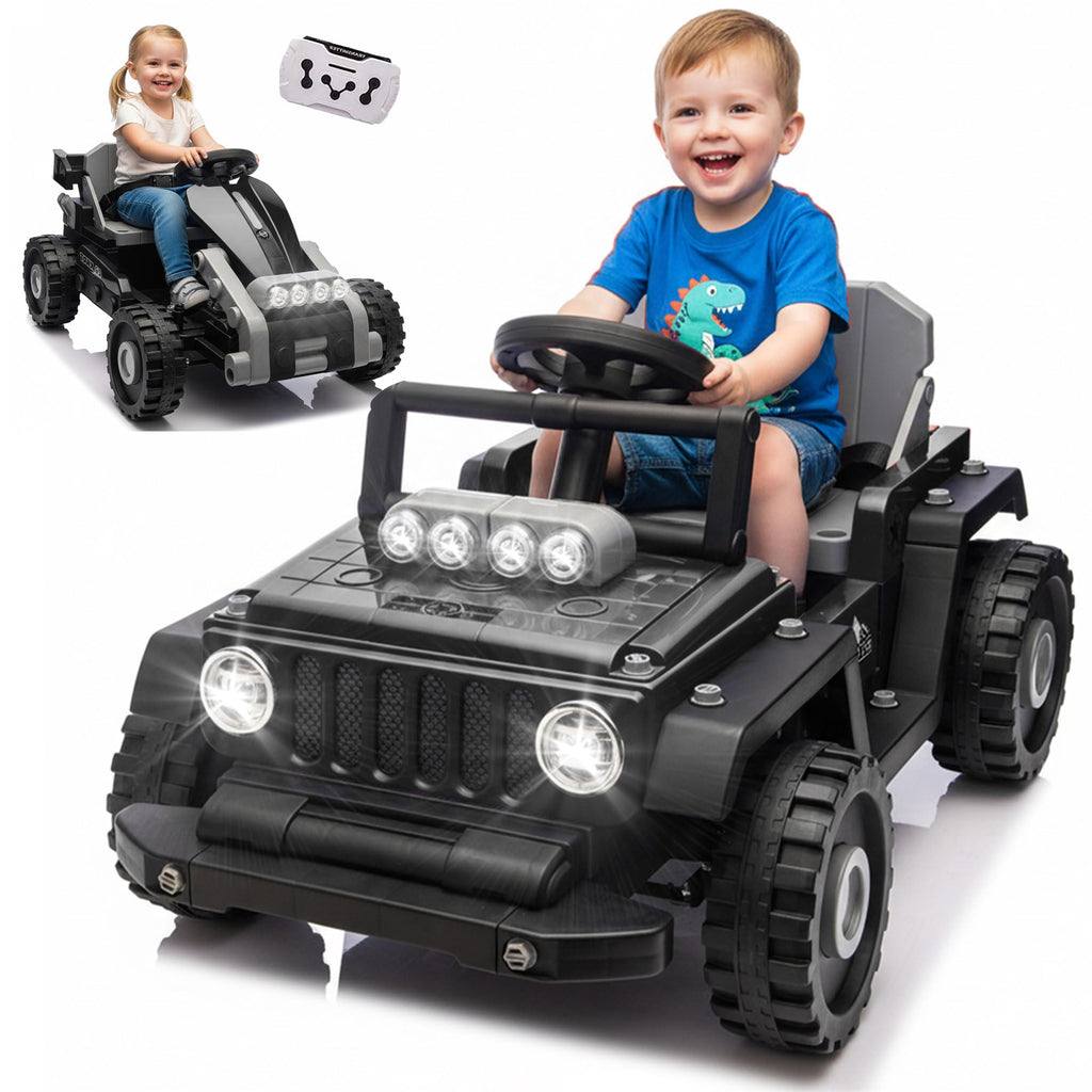 This 12V ride on toys innovative design enhances childrens hands-on skills, making ride-on transportation fun, educational, and inspiring creativity and driving excitement! Kids can build two exciting shapes-a jeep or a go-kart-on a universal chassis, perfectly combining the fun of building with the thrill of driving. With large, rounded bricks and smooth edges, this building toy offers a safe and risk-free experience, allowing children to explore freely while parents watch with peace of mind. The spacious 13.19 seat and four-wheel suspension ensure a comfortable and stable ride for young adventurers. This kids electric car glides effortlessly over tiles, grass, or light gravel, making both indoor and outdoor play a delight. For endless fun, the ride on car comes with Bluetooth, built-in music, a USB port, microphone jack, and adjustable volume-turning every ride into a mini concert. Bring home this innovative kids electric car and let your child enjoy the perfect combination of creative building, exciting driving, and interactive entertainment!