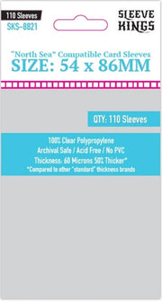 Sleeve Kings North Sea Compatible Sleeves (54x86mm) -110 Pack, 60 Microns ** Note Game Titles and their intellectual property rights are and TM of their respective rights holders, no challenge to these rights is expressed or implied. Compatibility claims only extend to the physical size of the cards in each respective game and no claim to endorsement or authorization by the respective rights holders is expressed or implied by Sleeve Kings. Our products are compatible with the respective games only and all rights are reserved by the respective rights holders.