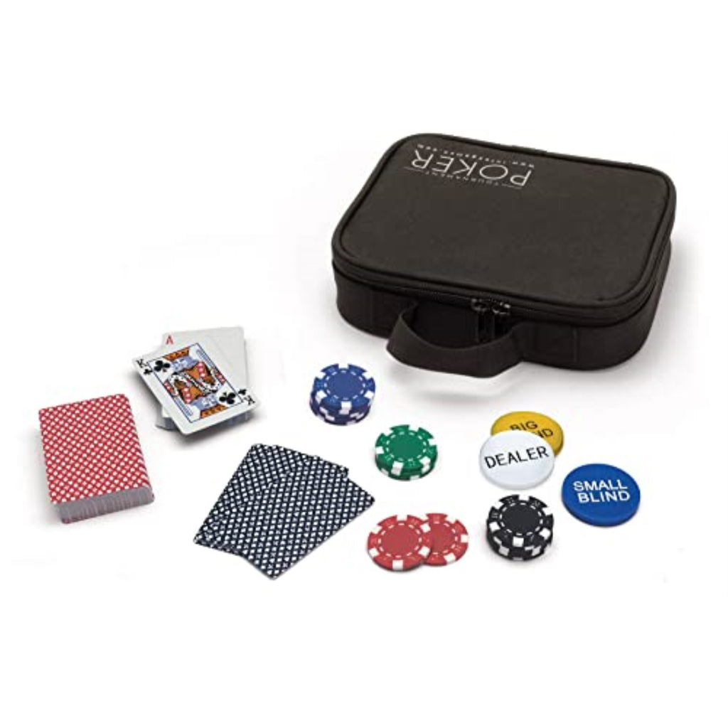 The Tournament Poker set includes weighted chess pieces, a roll-up silicone chess board, and a convenient travel bag for easy transport.