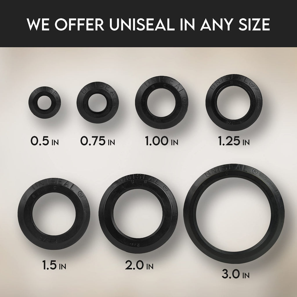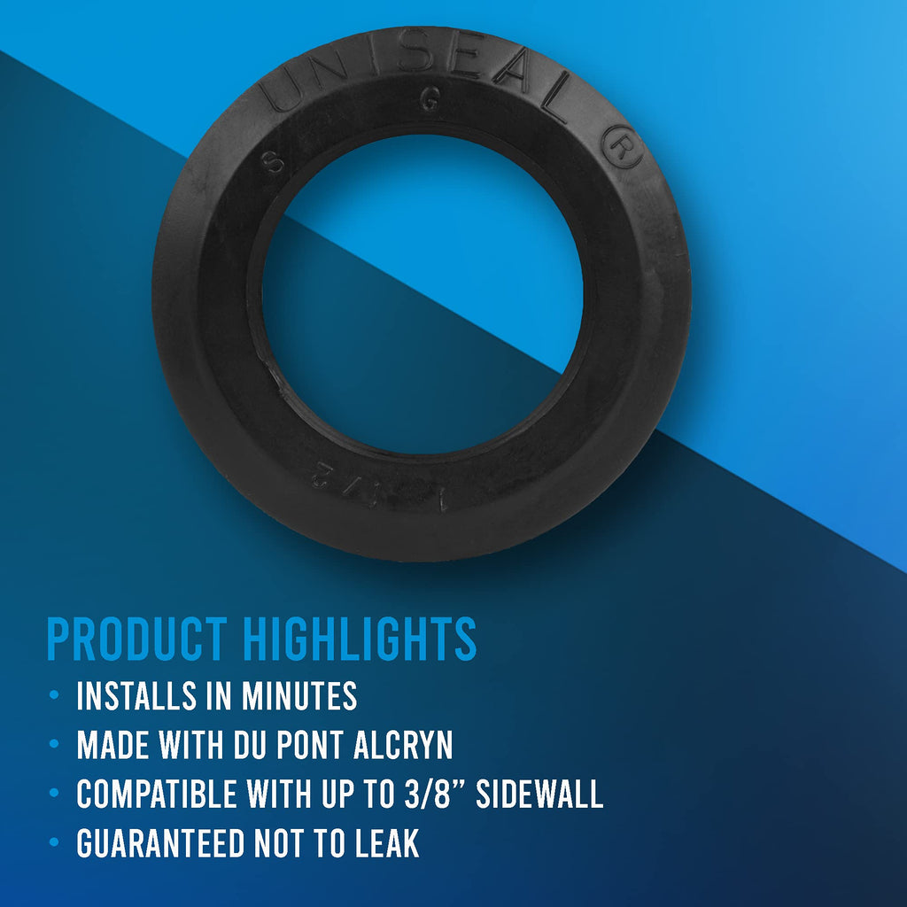 Made in the USA 100% Guaranteed Works with Sch 40 or Sch 80 PVC Pipe Installs in minutes Compatible with tanks up to 3/8wall thickness Made with Du Pont Alcryn Comes with detailed instructions Uniseal is simply the world's best seal. It is also incredibly easy to install. After cutting a hole in the wall of a tank or other surface, the seal is inserted. Then the pipe is coated with a slippery detergent (i.e. dish soap) and pushed into the seal. Uniseal products replace traditional plumbing hardware with a single injection molded unit requiring no component parts. It was designed to solve many of the issues of pipe to tank connections. For many industries pipe to tank seals are traditionally among the most complex connections to manufacture. Traditional seals require multiple parts such as, rigid flanges, bolts, washers, o-rings, along with long assembly times and high production costs. The Du Pont Alcryn is the key to the liquid-tight seal. When the pipe is pushed through the rubber-like Uniseal from the outside, the inside Alcryn wall becomes thin enough to allow the pipe to squeeze through and then forms a liquid-tight seal. The coefficient of friction with the plastic pipe is roughly three times higher than any other material which allows it to create a better seal than with any other material. In static conditions the seal is good up to 65 PSI. Uniseal can withstand pressure, and suction, acids, oils, greases, gasoline, sewage, waste, heat and cold. It offers long life, easy installation and reduced labor and material costs.