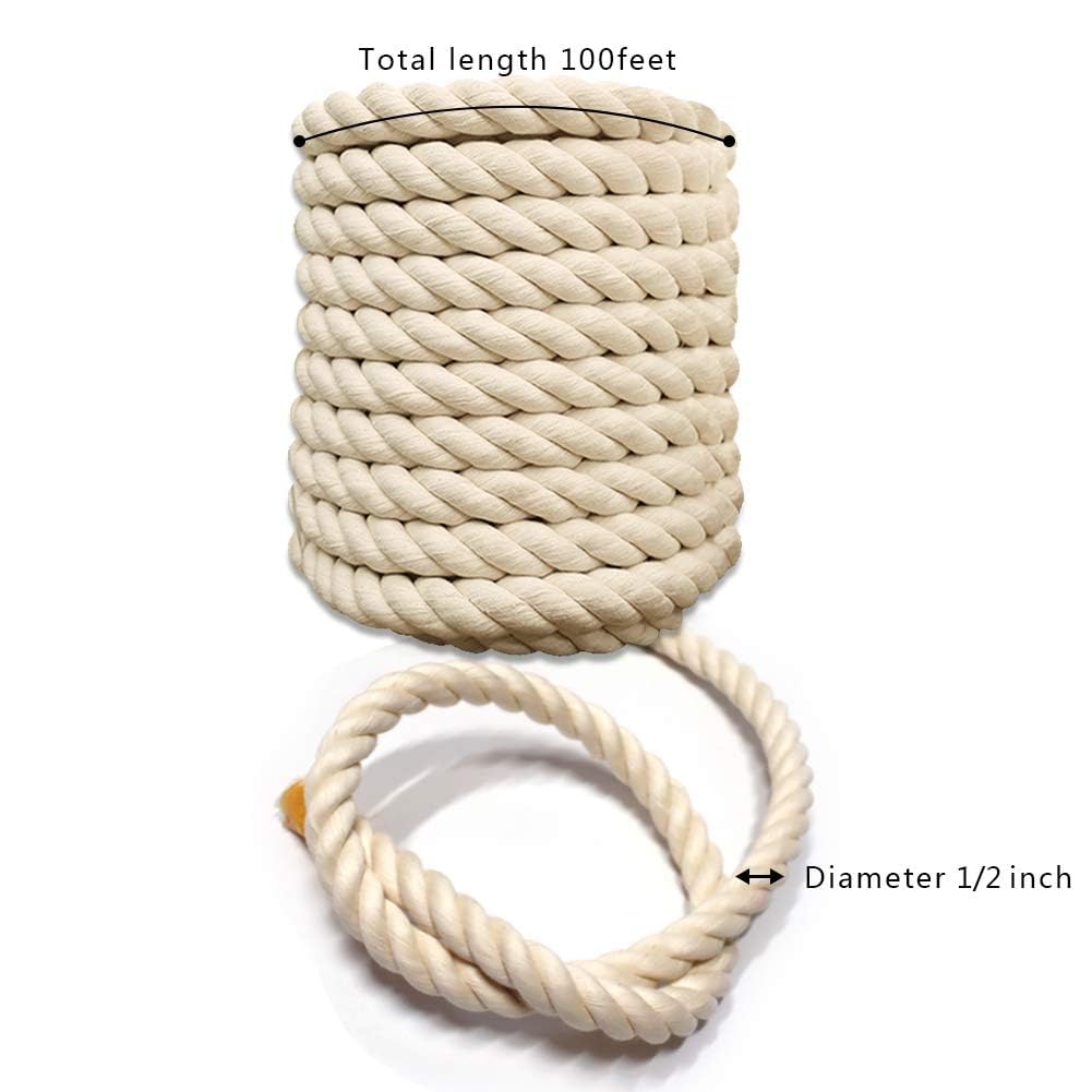 1/2 Inch x 100 Feet Natural Twisted Cotton Rope Strong Thick Soft Rope for Sports, Decor Crafts, Macrame,Camping, Wedding Ropes