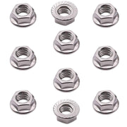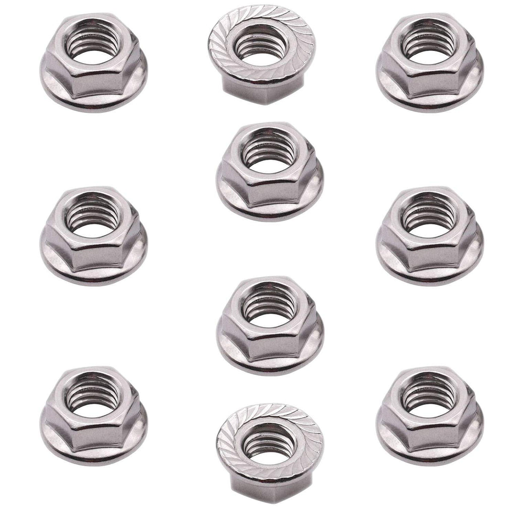High Quality 304 Stainless Steel 14-20 Serrated Flange Hex Lock Nuts Specifications: Nuts Type: Hex Serrated Flange Nut Material: 304 Stainless Steel ain color: Silver tone Thread Size : 14(D) Height : 58mm 023 Hex Width: 11mm 043 lange Diameter: 145mm 057 Thread count (inch): 20 Package Quantity: 50pcs x Hex Flange Nut eatures: 304 stainless steel has high strength and hardness ratings and resists corrosion in mild environments Flanged Nut serves to distribute the pressure of the Nut over the part being secured, reducing the chance of damage to the part and making it less likely to loosen as a result of an uneven fastening surface Because of the serrations they cannot be used with a washer or on surfaces that cannot be scratched The serrations help in avoiding vibration of nut and increase the holding power of nut Package Included: 14-20 -- 50pcs Warning: the product are small parts, keep away from children and kids