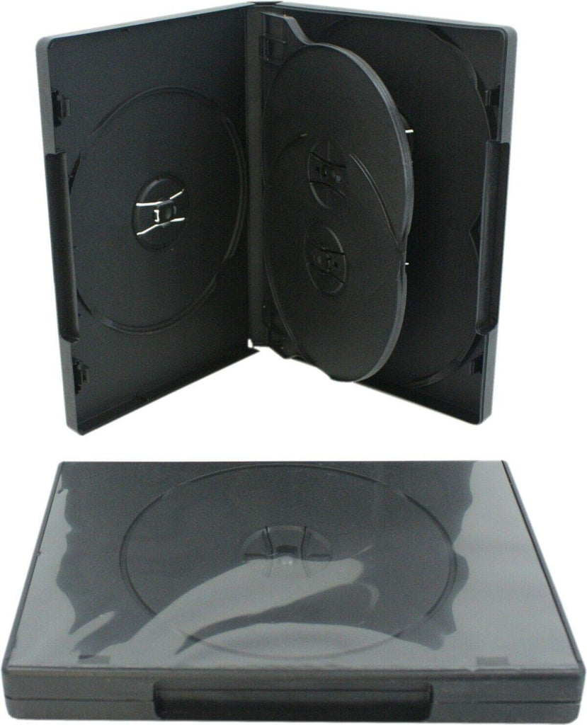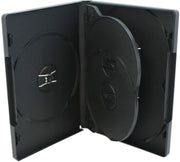This is a BLACK Five Quantity DVD box! This box has a full wrap around sleeve (this is where you slide the front paper / artwork into so it shows). It holds 5 discs in the space of 1 chubby DVD box. Two DVDs are held on the sides of the case and another three are held in two hinged center flaps. The cases are 22mm thick (a.k.a. .87). The hinged trays can be removed to make these a double, triple, or quad DVD box!