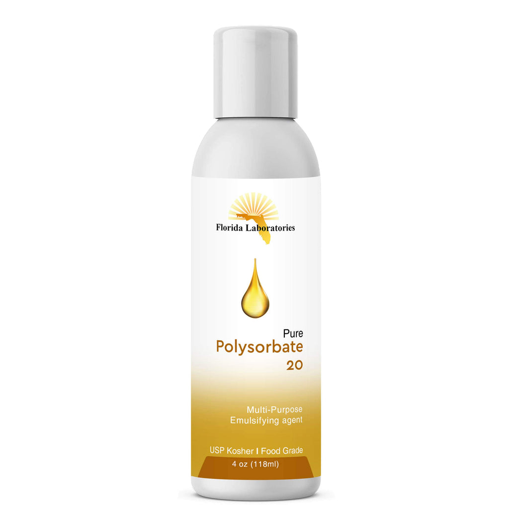For over 14 years, Florida Laboratories has been dedicated to continually improving existing formulas and developing new products to meet market needs We are committed to ongoing research for new and improved products and have implemented continuous laboratory quality assurance testing of all products to confirm the high standard we expect from our raw materials and finished products We are pleased to offer you the finest raw materials available for your needs on the planet You are buying 1 Bottle 4 oz Polysorbate 20 Kosher, Pure Food grade Keep out of reach of children
