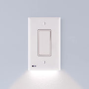 The SnapPower SwitchLight brings the convenience of the SnapPower guideLight to the standard Light Switch Remove your old switch covers and snap on the SwitchLight for beautiful lighting in secondsBecause light switches are typically higher on the wall than outlets, the downward shining light will illuminate a larger area and keep the light out of your eyes This also keeps the night light out of the reach of children and it stays visible above furniture Typical night lights shine upward and into your eyesWe included an adjustable switch so you can choose between bright, dim and off settings This allows you to use the light for identifying your light switch or for use as a night lightThe SwitchLight is perfect for use in Bathrooms, Kitchens, Entryways, closets, and BedroomsThe SwitchLight works when an overhead light is controlled by a single switch The SwitchLight was not designed for hallways or rooms with a switch at both sides controlling the same light