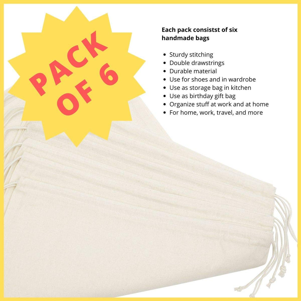 Six Pack of Versatile 14 x 17 Inch Cotton Muslin BagsUse these cotton drawstring bags and play your part to help save the environment. With these handy reusable pouches you do not need plastic bags. Just throw in the laundry to clean. Cotton allows for natural air to circulate and is ideal for pantry storage. Dampen the bags to keep veggies and fruit crisp in the fridge. Your produce will not get slimy like in plastic bags. Use them as original gift bags for birthday parties, weddings or other special occasions. Please wash the bags before first use. They may shrink by about 5 to 10% after the first wash. Features Keep stuff organized Save the environment 100 % cotton material Various handy sizes Gift bags for parties and birthdays Reduce, reuse, recycle! These items are made by hand. The actual size of the bags may vary ? due to variations in stitching and seams during production.
