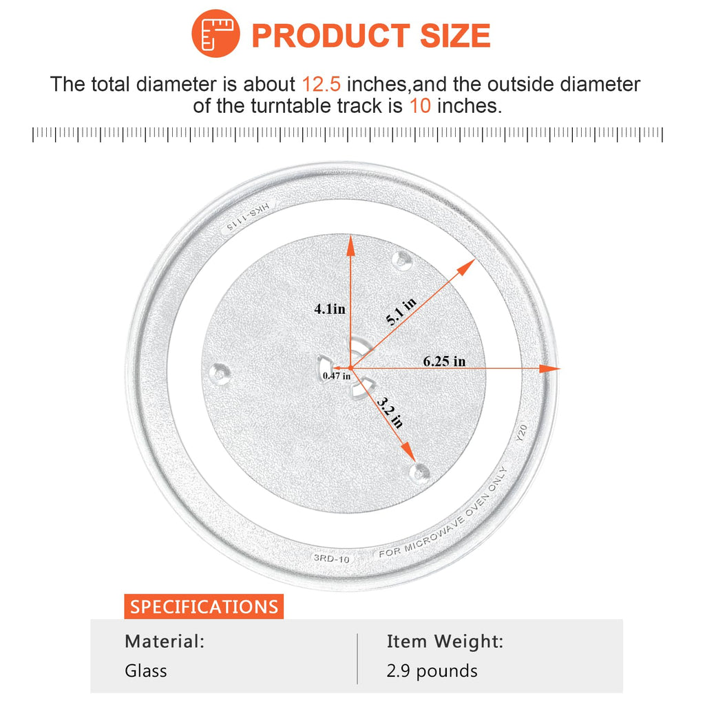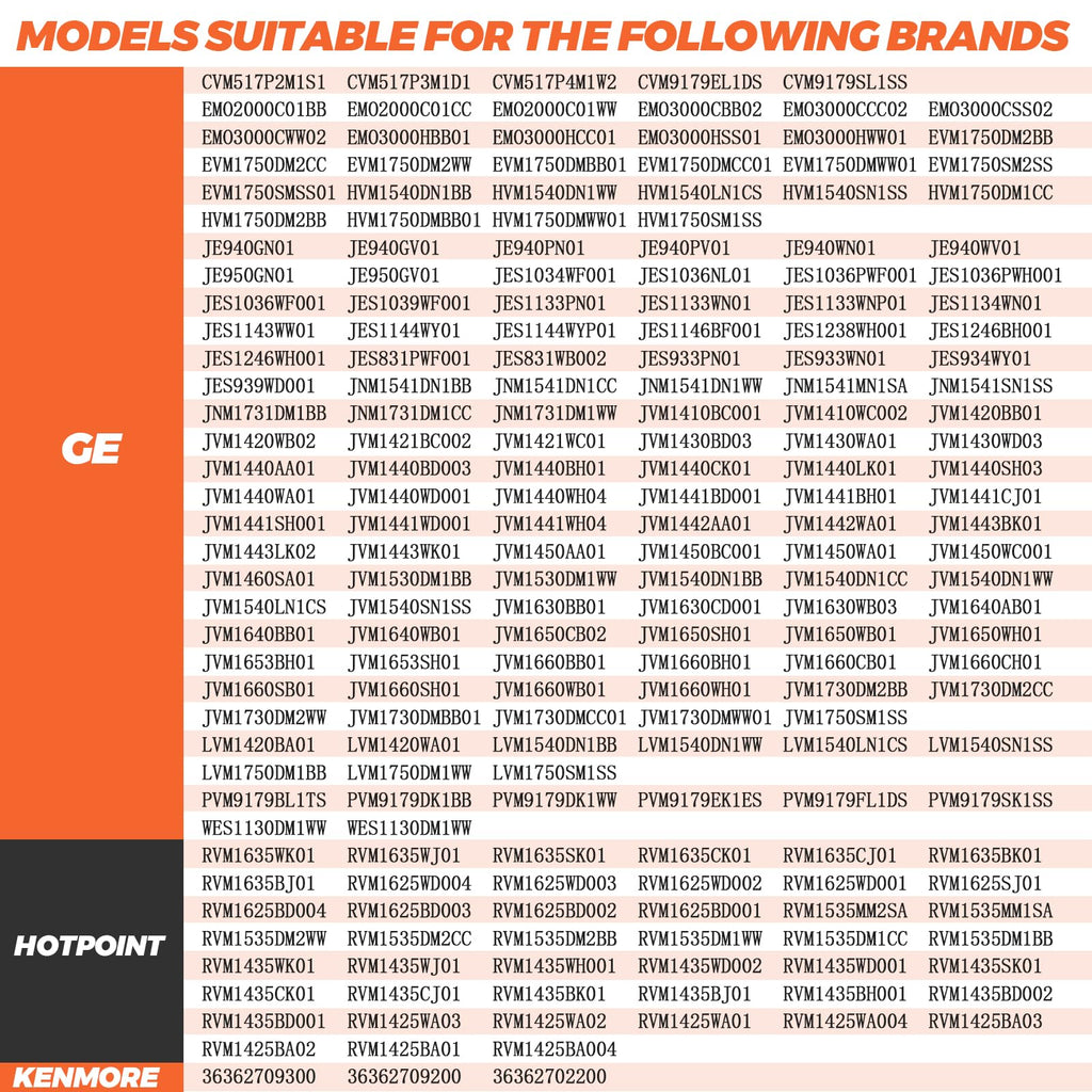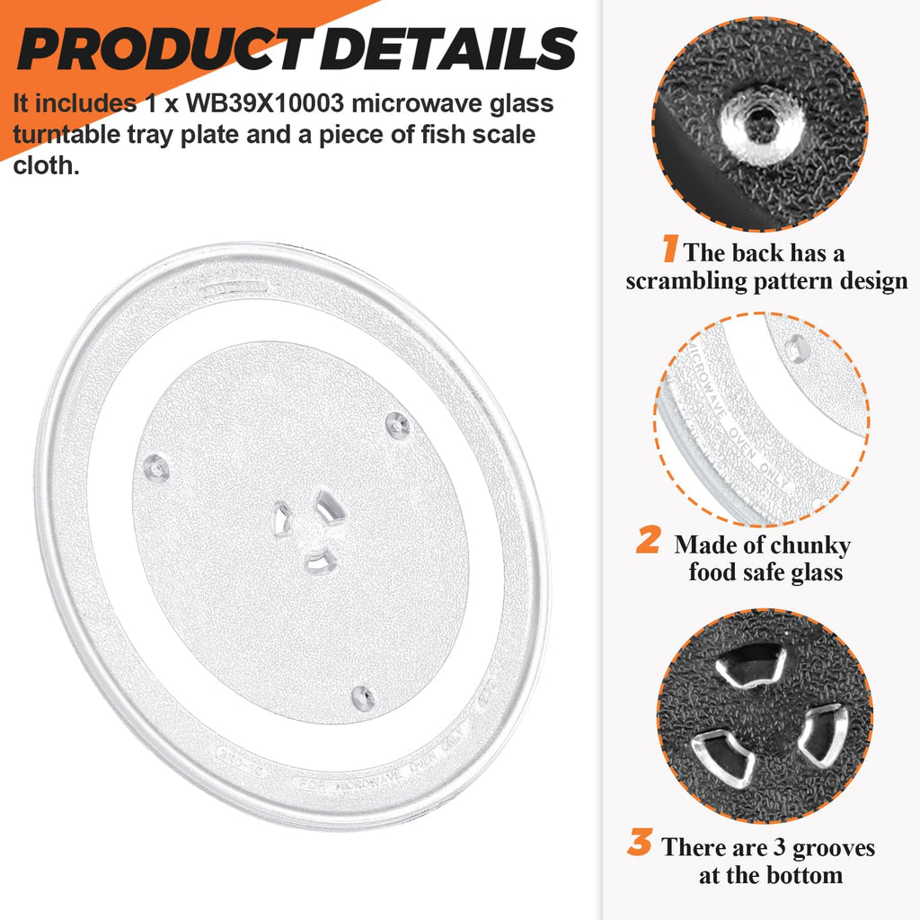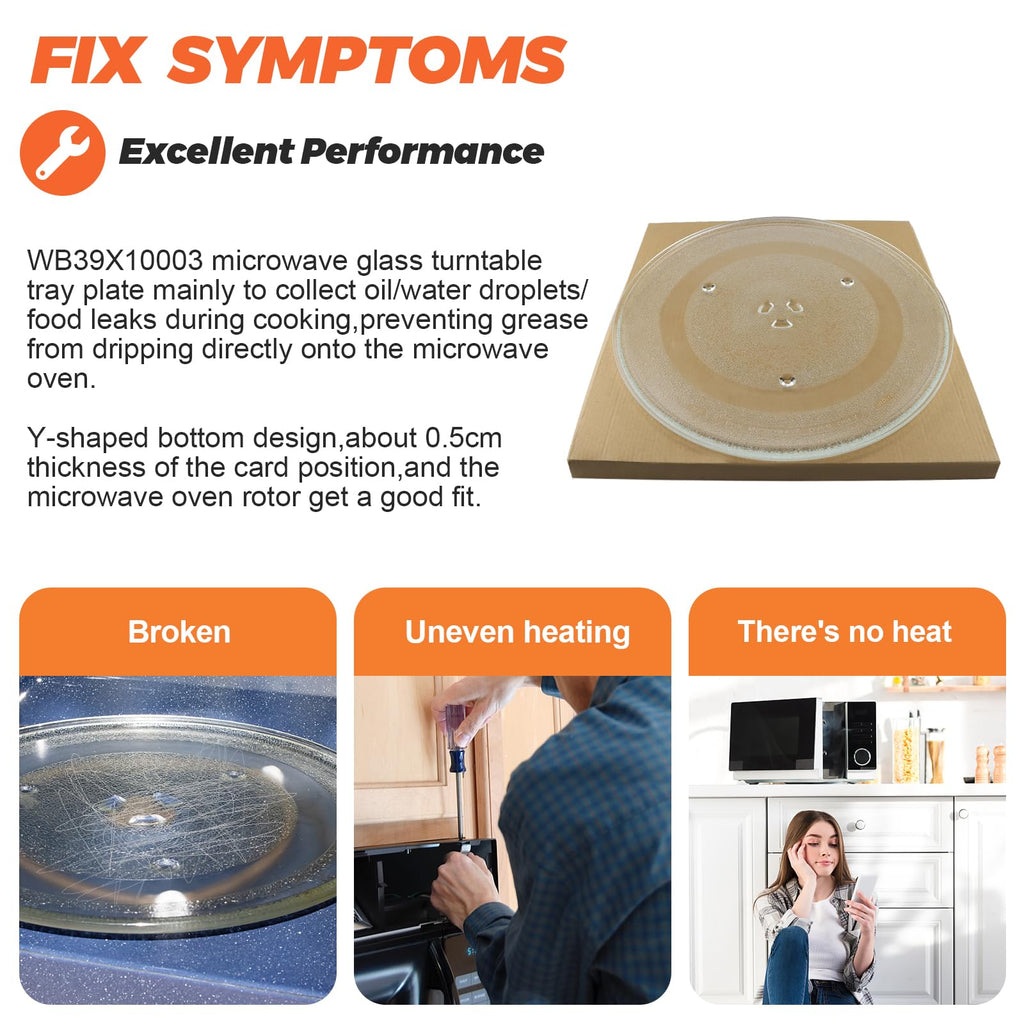PRODUCT DESCRIPTION:The WB39X10003 Microwave glass turntable tray is smooth, oil-resistant, easy to clean, made of strong and durable glass, and heat resistant. PACKAGE INCLUDE: 1* Microwave glass turntable tray INSTALLATION TIPS: First check the bushing connector and make sure it has three notches-these notches should be aligned with the middle of the board. Then measure the inside of the microwave to make sure it fits 12 and 1 / 2-inch plates. WORKS WITH MOST BRANDS: Amana, GE, Hotpoint, Ken-more, Samsung WORKS WITH THE FOLLOWING MODELS NUMBER: Ken-more: 36362702200, 36362709200, 36362709300 GE: JVM1650BB005, JVM1440BD001, JVM1441WD003, EMO2000C01BB, EMO2000C01WW, EMO3000HBB03, EMO3000HSS03, JVM1750DM1BB, JVM1440LK02, JVM1750DM1WW, WES1130DM1WW and more. Hotpoint: RVM1535MM2SA, RVM1535MM1SA, RVM1635WJ01, RVM1635WK01, RVM1625SJ01, RVM1535DM2WW, RVM1635SK01 and more. PLEASE NOTE:The brand name or model designation for this product is made solely for purposes of demonstrating compatibility. Thanks.