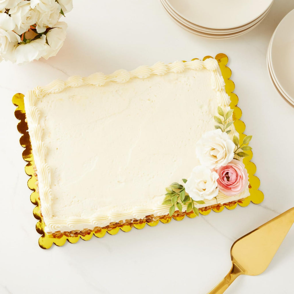Elevate your desserts with our pack of gold cardboard cake boards! These elegant and sturdy scalloped rectangle bases measure 10x14 inches, making them the perfect size for a wide range of baked goods, including cupcakes, gingerbread houses, and layer cakes. Crafted from high-quality materials, these cake boards rectangle shape are strong and durable, making them ideal for transporting your treats to parties, weddings, and other events. The gold foil finish adds a touch of sophistication and glamour to your desserts, making them stand out on any dessert table. These versatile 10 inch cake board sheets can also be used as a beautiful centerpiece for any special occasion. Simply place a floral arrangement or other decorative items on top, and you'll have a stunning display that's sure to impress your guests. The quarter-sheet size is perfect for those who enjoy baking and want to showcase their creations in a professional manner. These sheet cake boards are easy to use and clean, allowing you to focus on your baking skills and creating the perfect dessert.