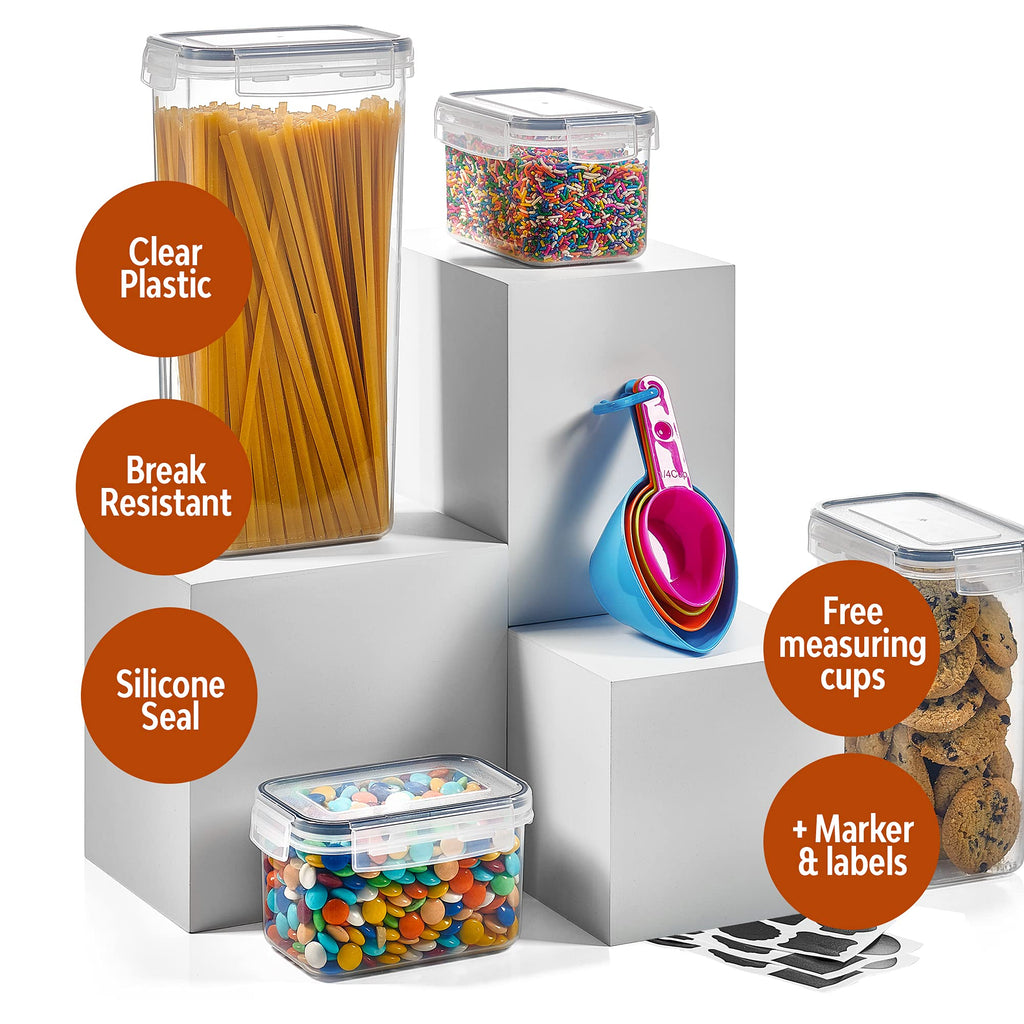 KEEP YOUR FOOD FRESHER with the SESENO 14 Piece Set Plastic Food Storage Container Made of high-quality food grade plastic, BPA-Free, non-toxic and safe from any harmful materials. Suitable for Beans, Flour, Sugar, Coffee, Rice, Nuts, Snacks, Candy, Pet Food & More Set Included: 2 Tall Container (11.83 cups / 95oz / 2.8 liters), 4 Large Container (8.45 cups / 68oz / 2.0 liters), 4 Medium Containers (5.92 cups / 47oz / 1.4 liters), 4 Small Container ((3.38 cups / 27oz / 0.8 liters), Free bonus labels with chalk marker & measuring spoon set. PRODUCT FEATURES: Airtight, Watertight, Leak Proof, Stackable Design, Non-Slip Lids, BPA Free, Reusable and Durable