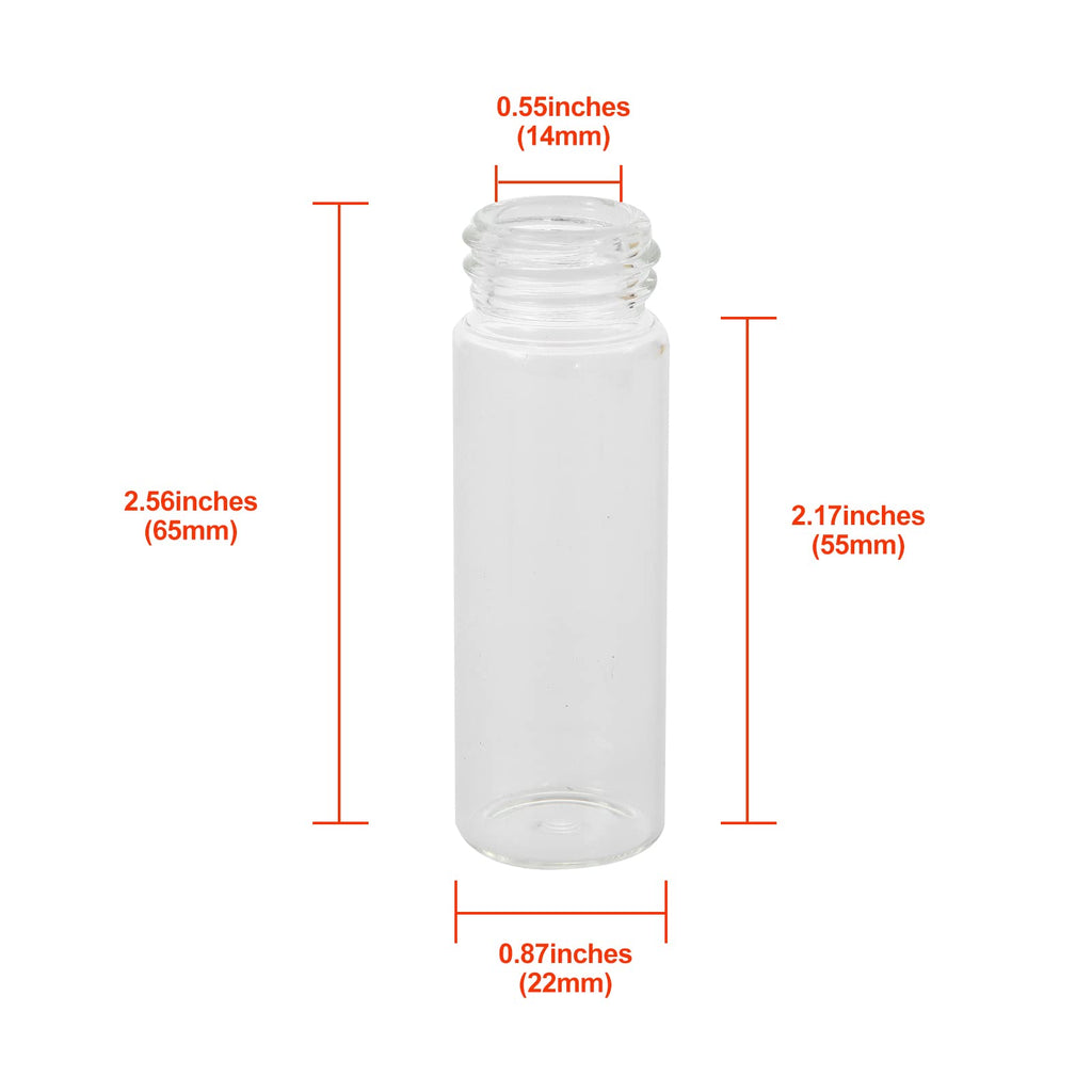 colour: clear Material: Borosilicate clear glass, aluminium Diameter: 22mm x 65mmInternal diameter: 12mm capacity: 15ml