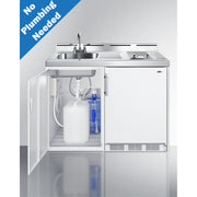 Summit Brings Innovation And Convenience To Non-Traditional Kitchen Spaces With A New Line Of All-In-One Kitchenettes Designed For Use In Settings Without Standard Water Lines. Great For Efficiency Housing, Off-Grid Living, And Temporary Or Basement Kitchens, The C48Elglasspump Is A 48 Inch Wide Kitchenette Composed Of A Refrigerator-Freezer, 2-Burner Radiant Cooktop, Sink, And Storage Cabinet That Can Be Used As A Portable Water Station. We Include Ckpumpkit, A Package That Features Everything You Need To Connect The Sink To A Removable 5 Gallon Water Jug To Pump Your Fresh Water Through The Included Faucet. The Kit Comes With A 5 Gallon Jug, 6 Gallon Waste Water Container, 110V Water Pump, And All Of The Hardware And Tubing You Need To Install Your Own No Plumbing Sink. The C48Elglasspump Features A Smooth 2-Burner Readiant Cooktop In Black Glass For Convenient Stovetop Heating. The Cooktop Includes Its Own Pre-Installed 3-Prong Cord For Easy Setup. It Ships With Our Popular Ct661W European Refrigerator-Freezer, Offering 5.1 Cu.Ft. Of Storage Capacity With Adjustable Glass Shelves, Door Racks, A Scalloped Steel Wine Shelf, And Large Crisper Drawer Ideal For Keeping Produce At Its Best. Sized Just Under 48 Inches Wide, The C48Elglasspump Comes In A Shallow 24 Inch Depth Ideal For Smaller Kitchens. It Features A Classic White Cabinet Finish With A Durable Stainless Steel Work Surface And Backguard. For More Storage Options, Add Our Apss48 Appliance Station Shelf Or Our Selection Of Wall Cabinets. This Unit Ships On One Pallet In Three Overboxed Packages (Kitchenette, Refrigerator, And Pump Kit). Just Slide The Refrigerator In, Install The Pump Kit, Plug In The Appliances, And Enjoy Your Fully Functional Efficiency Kitchen With No Plumbing Required!