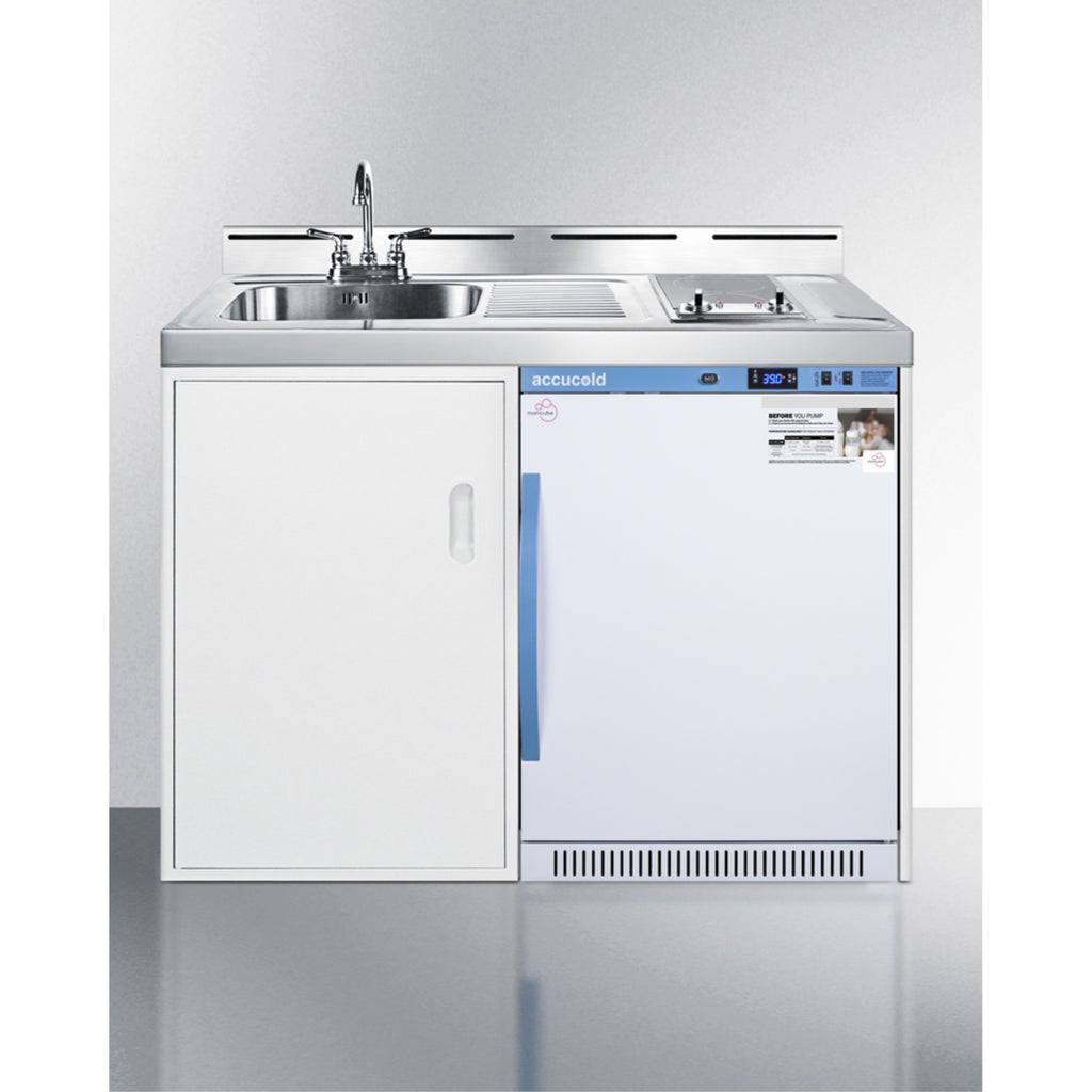 Summit Brings Innovative Value Into The Workplace With All-In-One Combination Units For Full-Service Use. Two Electric Burners, A Momcube Breast Milk Refrigerator, Sink, And Cabinet Space Create A Complete Kitchen Experience. At 48 Wide And 24 Deep, The C48Elmclk Provides All The Convenience Of A Kitchen In A Slim-Fitting Design. The Stainless Steel Work Surface Offers Plenty Of Space For Food Preparation, With A Sink And Faucet Included To Meet Your Hand And Material Washing Needs. A 115V Smooth-Top Cooktop With Two Elements Is Built Into The Top, Providing The Ability To Prepare Food, Thaw Breast Milk, Or Sanitize Nursing Equipment As Needed. The Cooktop Is Equipped With A Pre-Installed 3-Pronged Cord For Easy Setup.The 6 Cu.Ft. Mlrs6Mclk Momcube All-Refrigerator, Purpose-Built For Proper Breast Milk Storage, Slides In Under The Counter. This Unit Is Specially Designed And Tested To Store Breast Milk According To The Cdc'S Guidelines. It Has An Led Display That Allows Users To Monitor And Change The Temperature As Needed. The User-Reversible Door Provides Flexibility In Unit Placement, And Includes An Antimicrobial Handle Powder-Coated With Naturally Occurring Silver Ions Helping To Reduce Germ Spread In High-Traffic Environments. A Keyed Lock Offers Added Security. Inside, The Mlrs6Mclk Has Two Lockers, Each With A Combination Lock To Ensure Privacy For Mothers Storing Milk Or For Added Private Storage Needs, With A Master Key Included For Use As Needed. A Soft Led Light With An On/Off Switch For Easy Viewing Of The Interior.Under The Sink, The C48Elmclk Includes A Large Cabinet Ideal For Dry Storage, With A Removable Shelf For Added Efficiency. We Also Offer Optional Wall Cabinets For Additional Storage Convenience, As Well As Our Apss48 Appliance Station Shelving System That Can Be Installed Over The Kitchenette To House A Microwave, Coffeemaker, Or Other Items.The C48Elmclk Ships On One Pallet And Is Designed For Easy Setup. Perfect For Breakrooms, Wellness Rooms, Daycare Centers, And Similar Environments Seeking A Full-Capacity Kitchen Area In A Slim-Fitting Design. Additional Choices Are Available With Interior Refrigerator Shelving (C48Elmc) Or With A Storage Shelf And Microwave Included (C48Elmcmw).