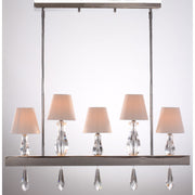 To maintain the chandelier, gently dust the metal framing and silk shades with a soft cloth. For deeper cleaning, consider using a mild glass cleaner on the crystal components. Always ensure the chandelier is turned off and cool before cleaning.