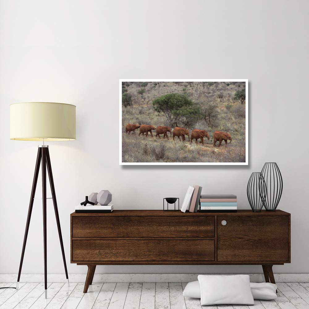 The artwork depicts a natural setting in Tsavo East National Park, showcasing the habitat of African elephants.