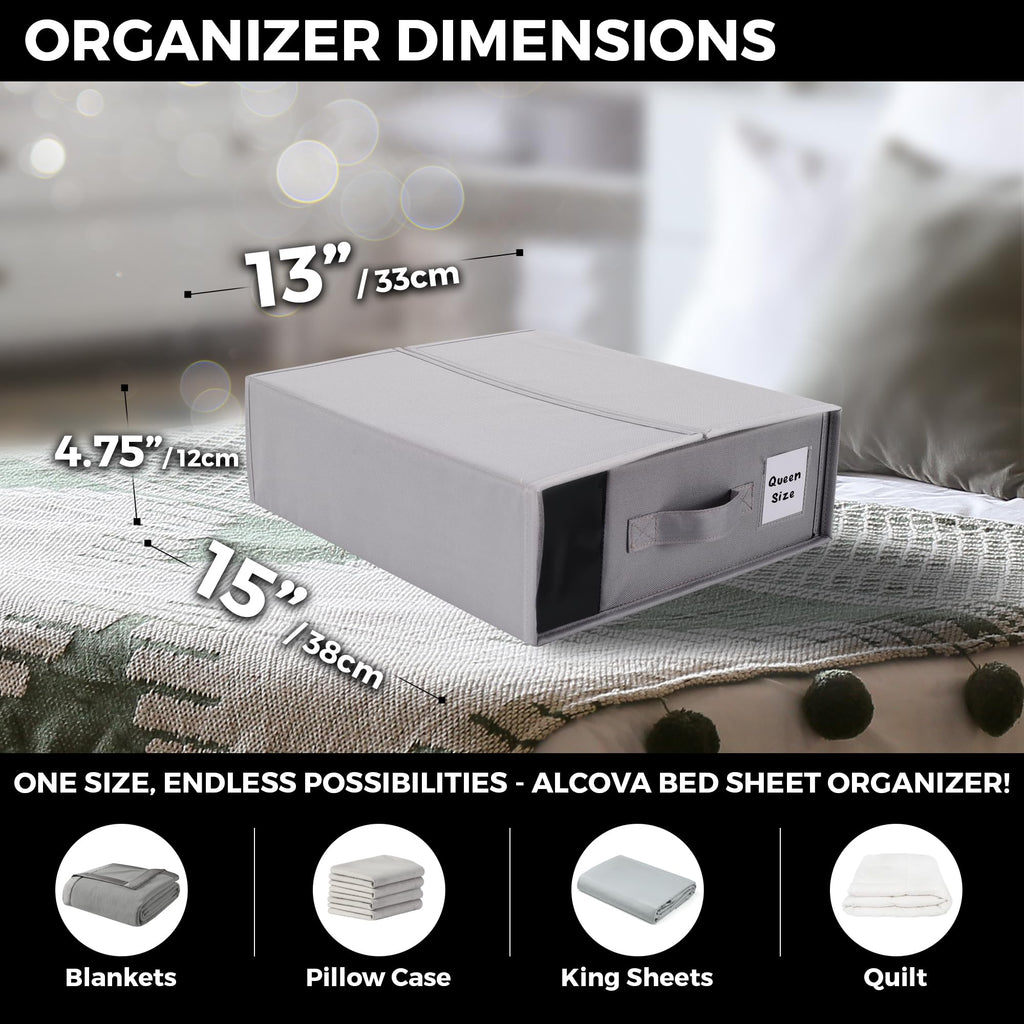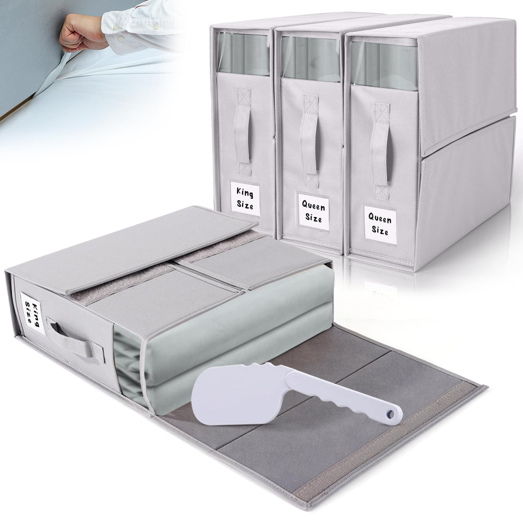 ALCOVA 4 Pack Bed Sheet Organizers and Storage with 1 Bed Sheet Tucker, Linen Closet Organizer Fits Queen & King Sheets, Bed Sheet Storage Organizer with Wide Window and Sturdy Handle, Organizador de s banas, (Silver Grey)