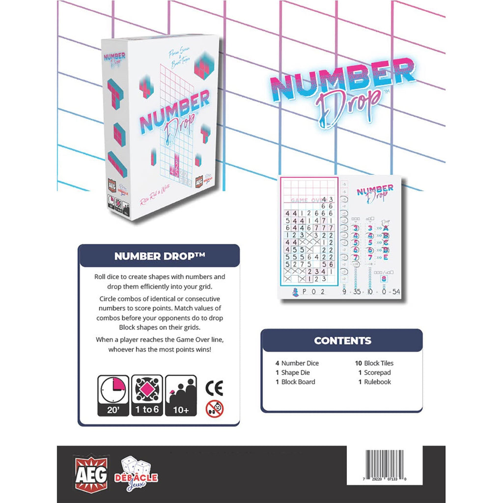 In AEG Number Drop, players roll dice to create Tetris-style shapes filled with numbers and efficiently drop them into their grid. The objective is to circle combos of identical or consecutive numbers to score points while blocking opponents.