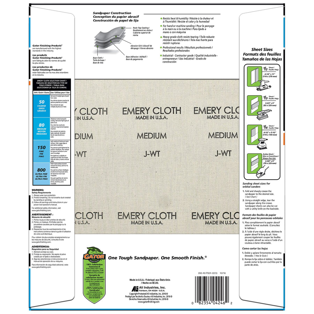 Product Description Medium Grit Emery Cloth Is Perfect For Smoothing Out Various Metal Surfaces. Its Natural Emery Abrasive Makes The Sheet Ideal For Sanding, Scouring, Polishing And Removing Cutting Tool Marks On Various Types Of Metal, Making It A Versatile Tool. Natural Emery Abrasive Is Firmly Bound To The Backing For Quality Scouring And Polishing On A Variety Of Metals, Woods, And Composites. This Closed-Coat Cloth Delivers Medium Material Removal With An Extended Life That Makes It A Good Value In Your Workshop. From The Manufacturer Gator Grit 25 Count 9,, X 11 80 Grit Medium Emery Cloth. The 80 Grit Medium Emery Cloth Is Designed To Sand And Finish Steel, Copper Piping, Brass, Iron, Aluminum And Stainless Steel. The Crocus Cloth Can Be Used On Either A Hand Or Machine Sander. If Using An Orbital Sander, The Crocus Cloth Can Be Cut Into A 1/2 Sheet, 1/3 Sheet, Or 1/4 Sheet To Fit The Sander.