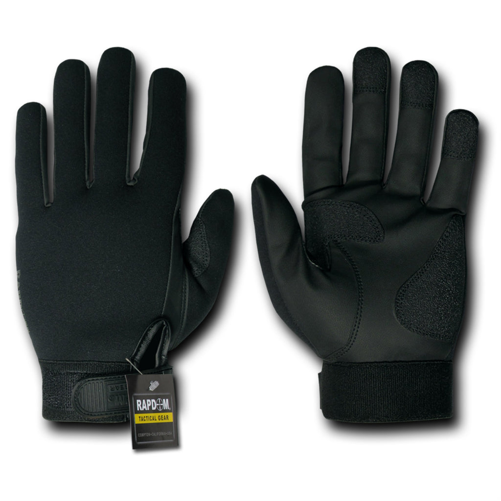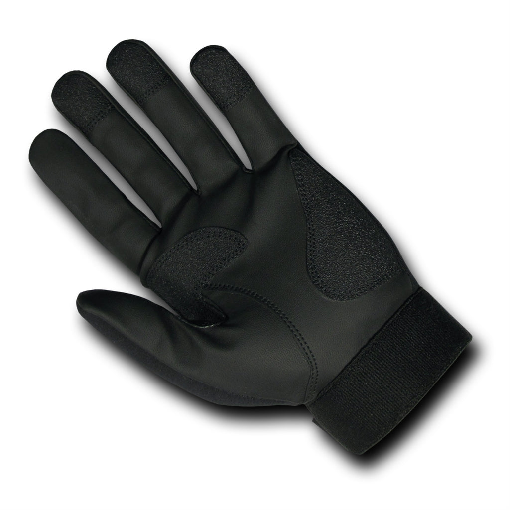 The Rapdom Tactical All Weather Shooting Gloves feature a Hook and Loop closure for a secure fit, flexible 2 mm neoprene on the backside for comfort, a palm made of Sensifil material, and grip patches sewn onto the palm and all fingertips except the index finger.