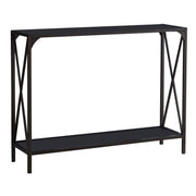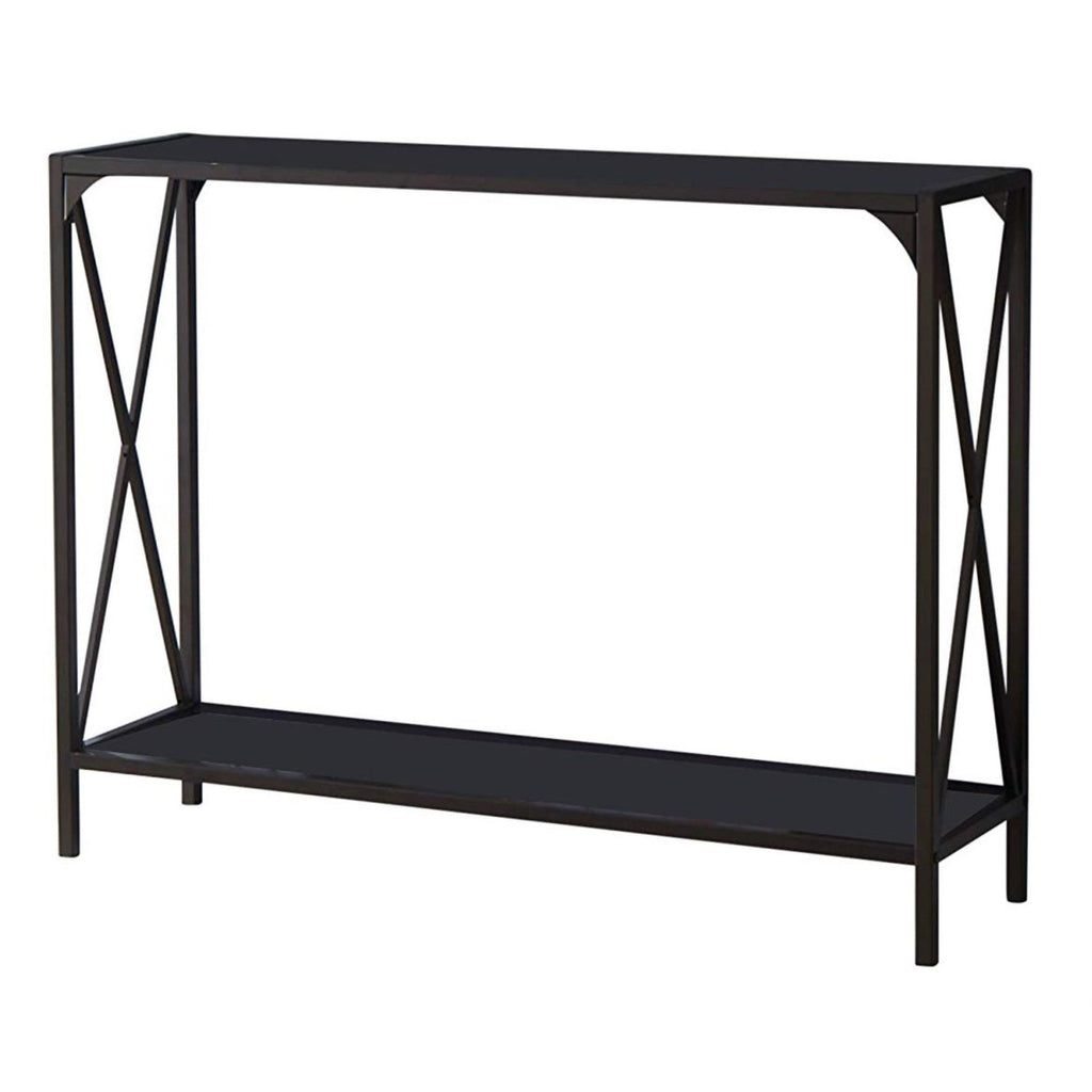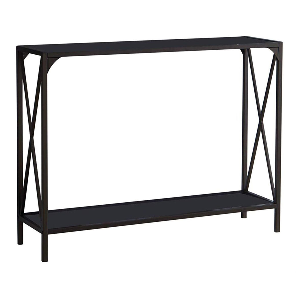 Allegheny Entryway Sofa Console Table, Pewter Metal Frame & Black Glass Top, Modern With Storage Shelf