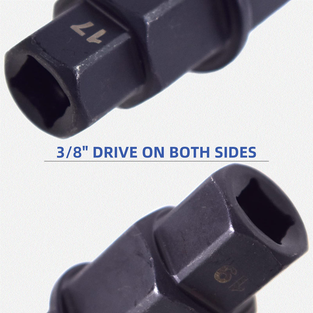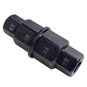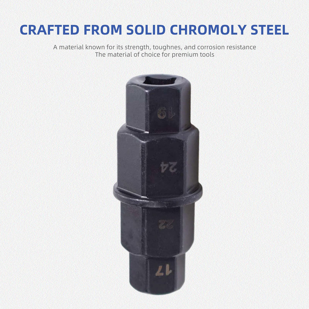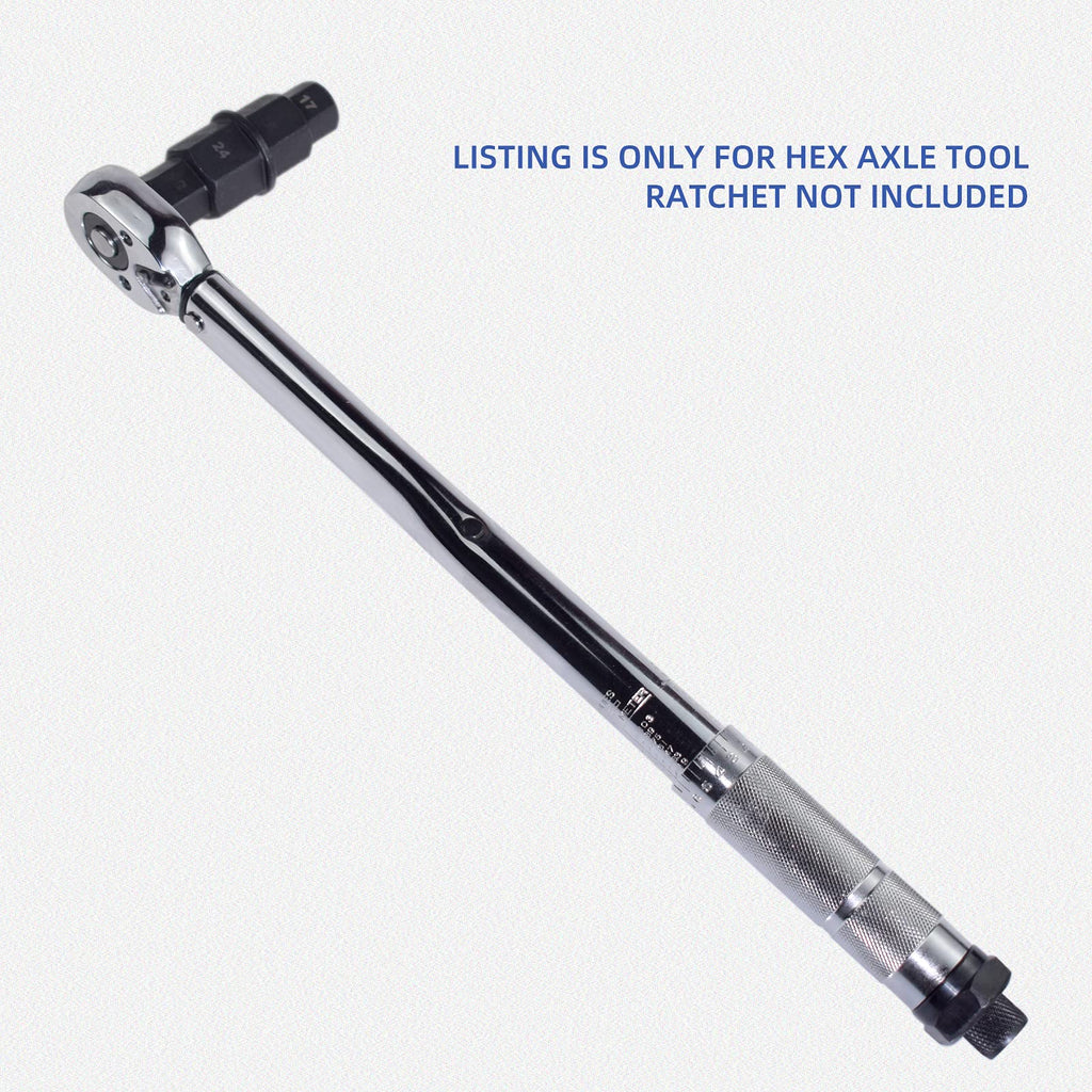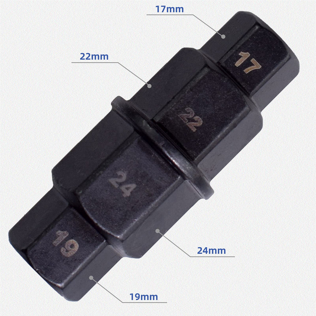 Motorcycle front rear wheel axle hex spindle driver socket tool 17/19/22/24mm is designed for easy safely installation, removal, or adjustment of front tire axles on sport and dirt bikes with hexagonal axle holes. Ensures proper fork alignment on the axle to prevent fork binding. Allows the user to single-handedly complete a tire change within minutes and without additional help. An essential tool for removing the front tire of a motorcycle. Motorcycle axle tool is constructed from high quality moly (CrMo) steel for strength and longevity. ?Applicable? Compatible with Honda CBR600RR, CBR1000RR, CR125, CR Series, CRF Series. Compatible with Kawasaki ZX6R, ZX6RR, ZX600 , ZX7R, ZX9R, Z1000, ZR Series, ZZR Series, ZRX Series, ZX11, KX Series. Compatible with Suzuki GSXR600, GSXR750, GSXR1000, DL1000, SV1000, RM Series. Compatible with Yamaha R1, R6. Compatible with Buell XB12R, XN12S, XB9R, XB9S. Compatible with BMW R1200, K1200S, K1200R, K1200GT, F800X. Can be used on an array of bikes. Some applications include the CB1000RR, CBR600RR, R600, GSXR1000, R1, R6, and R1000 bikes. ?Specification? Material: Moly (CrMo) steel Maximum torque of 150 pounds on a 3/8-inch square drive. Length: 75mm. Four metric hex sizes: 17mm, 19mm, 22mm, 24mm. The 19mm side can be used with a 3/8 drive ratchet or an an open end wrench, and the 17mm side can be used only with an open end wrench. ?Installation and use? You can use this tool as a screwdriver handle, by connecting a half inch drive extension with a socket and turn it with a wrench.