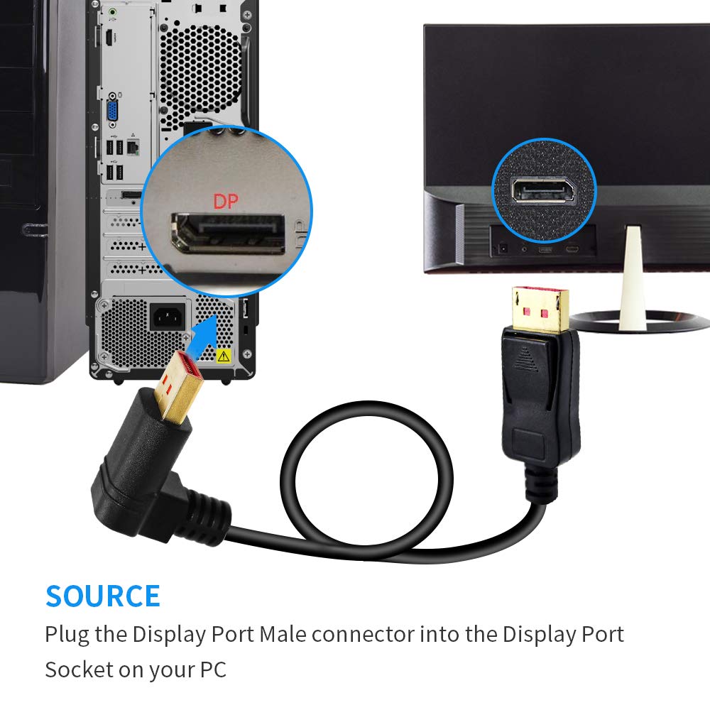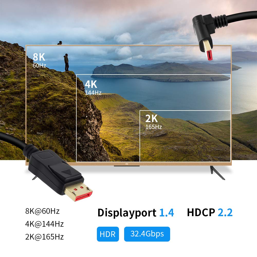 Package Included: right-angle DP 1.4 Cable X 1pcs Item Information 1. DP 1.4 compliant Male to Male 2. resolutions up to 8K (7680x4320) @ 60Hz 4K/144Hz 3. A proper cable to fit the tricky scence and prtect your dp interface ?Note? Plz DO check your device and our cables carefully to choose the proper angled cable.
