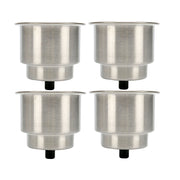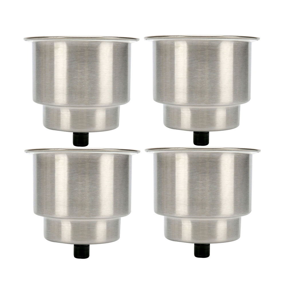 arameter Hole cutout needed - 3-34 Diameter inside (small) - 2-58 Diameter inside (large) - 3-58 Diameter overall lip outside - 4-14 Height overall including drain fitting - 4 Height overall excluding drain fitting - 3-14 Specification Replaces plastic drop-in cup holders with ease Made of Amarine Made stainless steel for supreme corrosion resistance Install almost anywhere table, counter top, dashboard,seatback, etc Includes drain with hose barb, mounting gasket and internal pad Stainless steel self draining recessed cup holderackage 4 X stainless steel cup holders