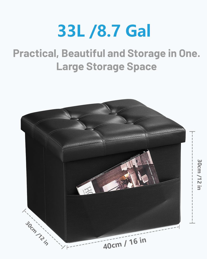Specification: Brand Name: AmasSmile Color: Black Material: Faux Leather with MDF board Seater Filling Material: High Resilience Sponge Unfolded Size: 16 x 12 x 12 inches Notes: Please avoid climbing and jumping on the ottoman to avoid falling or injury.