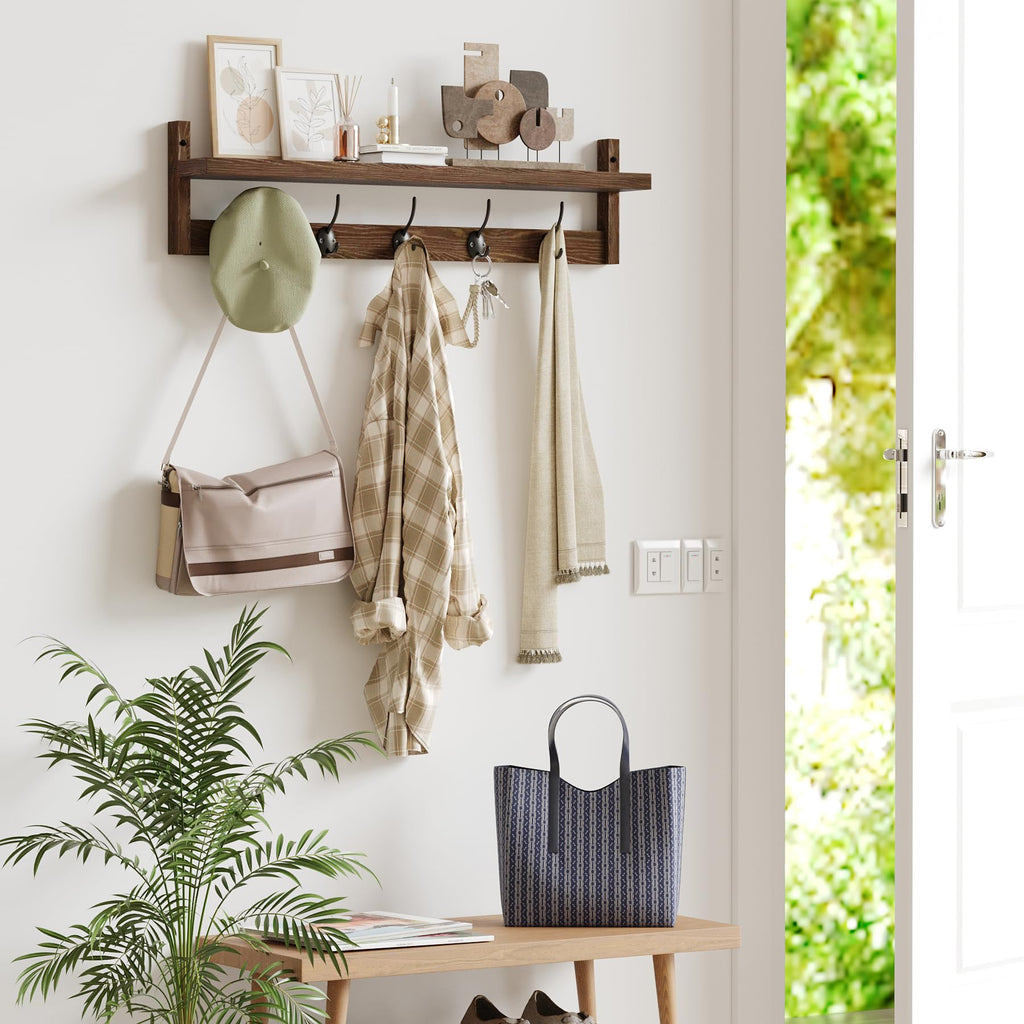 AMBIRD HOME We are a professional manufacturer of wood products specializing in bamboo R&D, bamboo furniture production for more than 20 years. With a very professional after-sales consumer service, we can respond to you within 24 hours. Sincerely look forward to working with you to create a beautiful living. Bigger side make more space: The wall shelf with hooks are 28.93 inches in length. The distance between the centers of hooks is 5.12 inches, which is bigger than most other wall hook racks, can put bigger clothes, umbrellas, scarfs and any other items Create a mini display area for you: The top shelf provides a mini display area for your photo frames, small decorative pieces, decorative letters and other items. These items not only make you smile when you go home, but also give them a chance to show its unique charm Stylish design adds a beautiful landscape to your room This multi-purpose entryway shelf with hooks can be used in your entryway, living room, bedroom, kitchen, etc. With the rustic white finish, this coat rack shelf fits perfectly with any styles of rooms 100% Satisfaction We provides you with professional customer service both before and after your purchase. We provide you with professional customer service before and after your purchase. Due to insufficient inspection by our factory personnel, there may be some lack of hardware or screws. If this happens, please contact us immediately and we will resend a new set for you free of charge. No matter what happens to the product, please contact us and we will help you solve any problems Specification: ?Color: Dark brown(Retro) ?Weight capacity: 66lbs(30kg) ? weight limit for each hook: 11 pounds(5kg)?Material: High-quality solid wood ?Dimensions: 28.93*7.28*4.52inch(73.48*18.49*11.48cm)