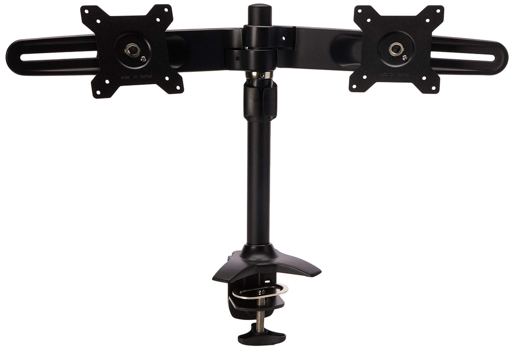 This incredibly versatile product supports up to two 24 monitors each with a maximum individual weight of 26.5 lbs.Not only will this strong and sturdy mount have no trouble holding VESA certified 75x75 or 100x100 monitors, (fitting the above criteria), it is also extremely adjustable!Each monitor can be placed at a different height to accommodate different sized monitorsBoth monitors have 360 rotation (meaning landscape, portrait, or anything in-between)Also included is a +/- 20 tilt in any directionIndividual adjustments for BOTH Monitors, ensuring maximum user comfortHeight adjustable, with a maximum height of 13 from the desk to the center of the mounting deviceStudies show that dual monitors can increase productivity by up to 50%Benefits of Clamp Mounting:Clamp Bases are an excellent mounting option! They are screwed onto the edge of a desk for maximum space. (Clamp bases require a lip on the desk 8-50 mm thick and 85 mm deep)They are the sturdiest mount of the three kinds (stand, clamp and grommet)They take up the least amount of desk space (So much more room for activities!)