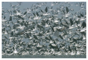 It is a paper art photograph depicting a flock of American Avocets erupting into flight in North America.