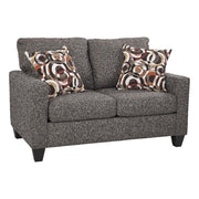 This Is An Urban Loft Track Arm Loveseat. It Is Apartment Sized. The Smaller Foot Print Will Fit Into Any Floor Plan. The Loveseat Is In A Great Neutral Charcoal Gray Woven Fabric With Vibrant Circle Motif Pillows. The Back Pillows Are Attached And The Seat Cushions Are Non-Reversible. This Allows Everything To Stay In Place. Clean Crisp Lines For A Modern Appeal. This Loveseat Can Seat Two Comfortably.