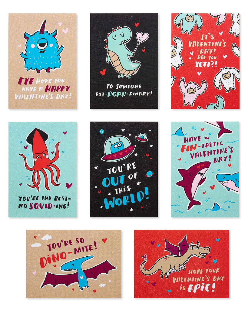Share little notes of kindness From American greetings mini note sets, the Epic Valentines collection includes a total of 40 mini note cards (5 each of 8 unique designs) with cute creatures kids will love, from dragons and dinosaurs to squids and sharks Share more and more often: mini encouragement cards offer fun phrases like, oue Out of this Worldoue So Dino-miteand ave a Fin-tastic Valentine DayShare them in the classroom and place them everywhere: in a friend locker, as lunchbox notes, as motivation notes for kids, on a teacher desk or under a fridge magnet All motivational cards feature blank space on the reverse side so you can add a personal note