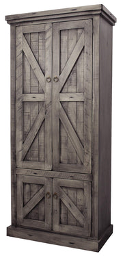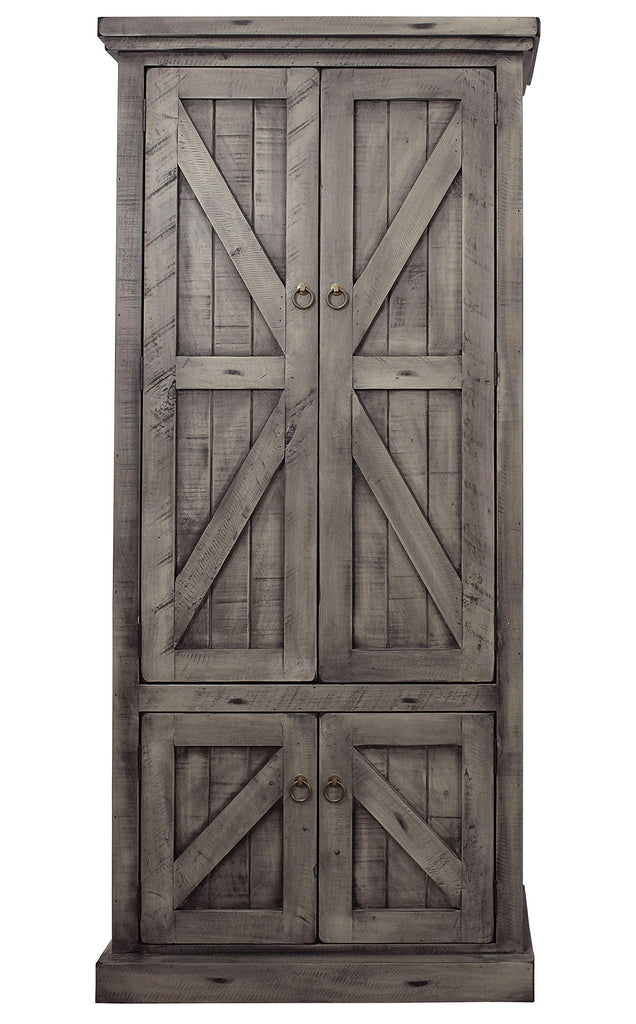 The pantry has a rustic barnwood finish, giving it a charming, farmhouse-style appearance.